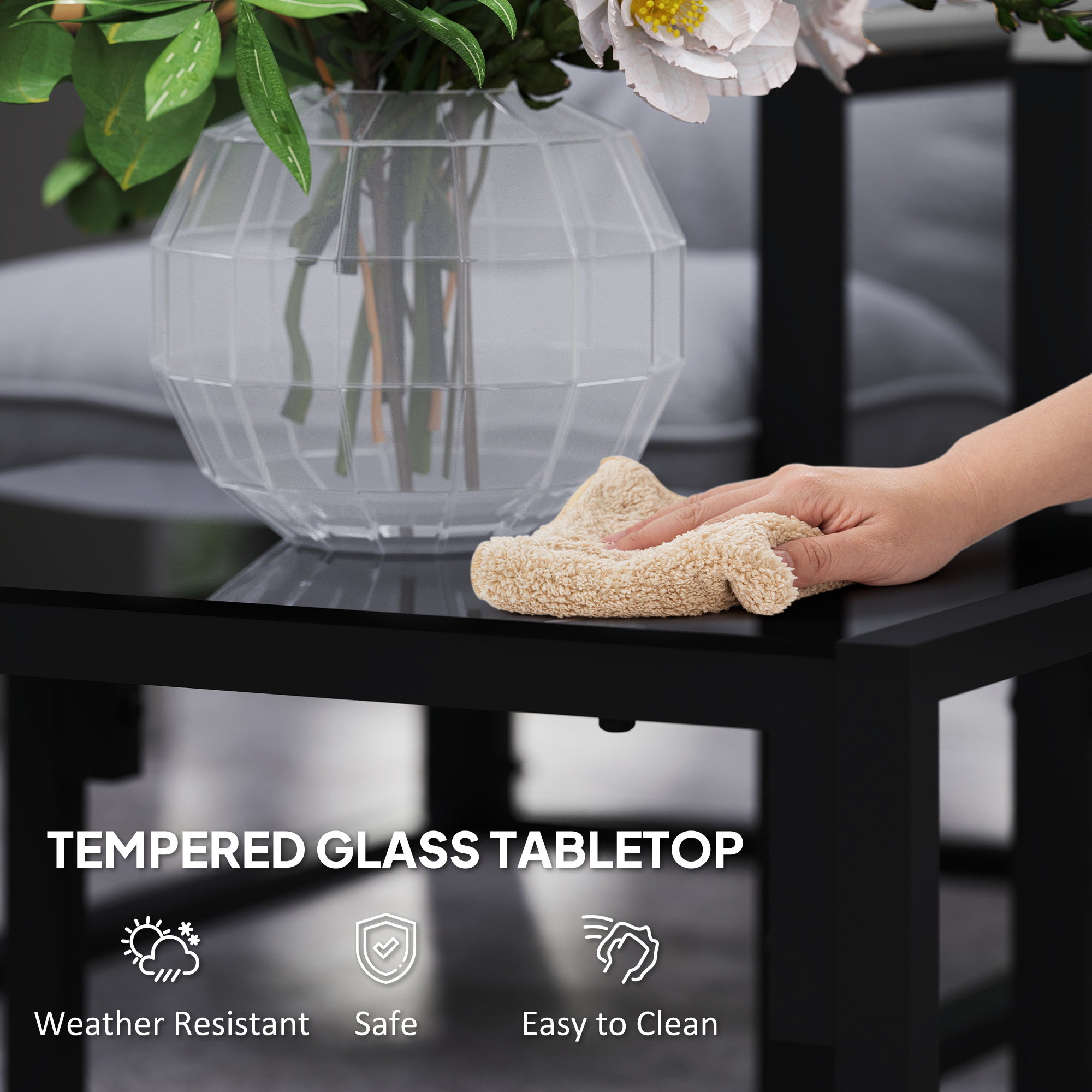 Create an inviting outdoor space with the Outsunny conservatory furniture. This garden set includes a loveseat, two armchairs and a matching coffee table, all built with steel frames for added durability. The cushions provide extra comfort, making it great for relaxing or entertaining. The tempered glass top table adds a stylish yet tough element, suit for drinks or decorations. Whether in your garden, balcony or conservatory, this outdoor table and chairs can elevate any outdoor area with ease.