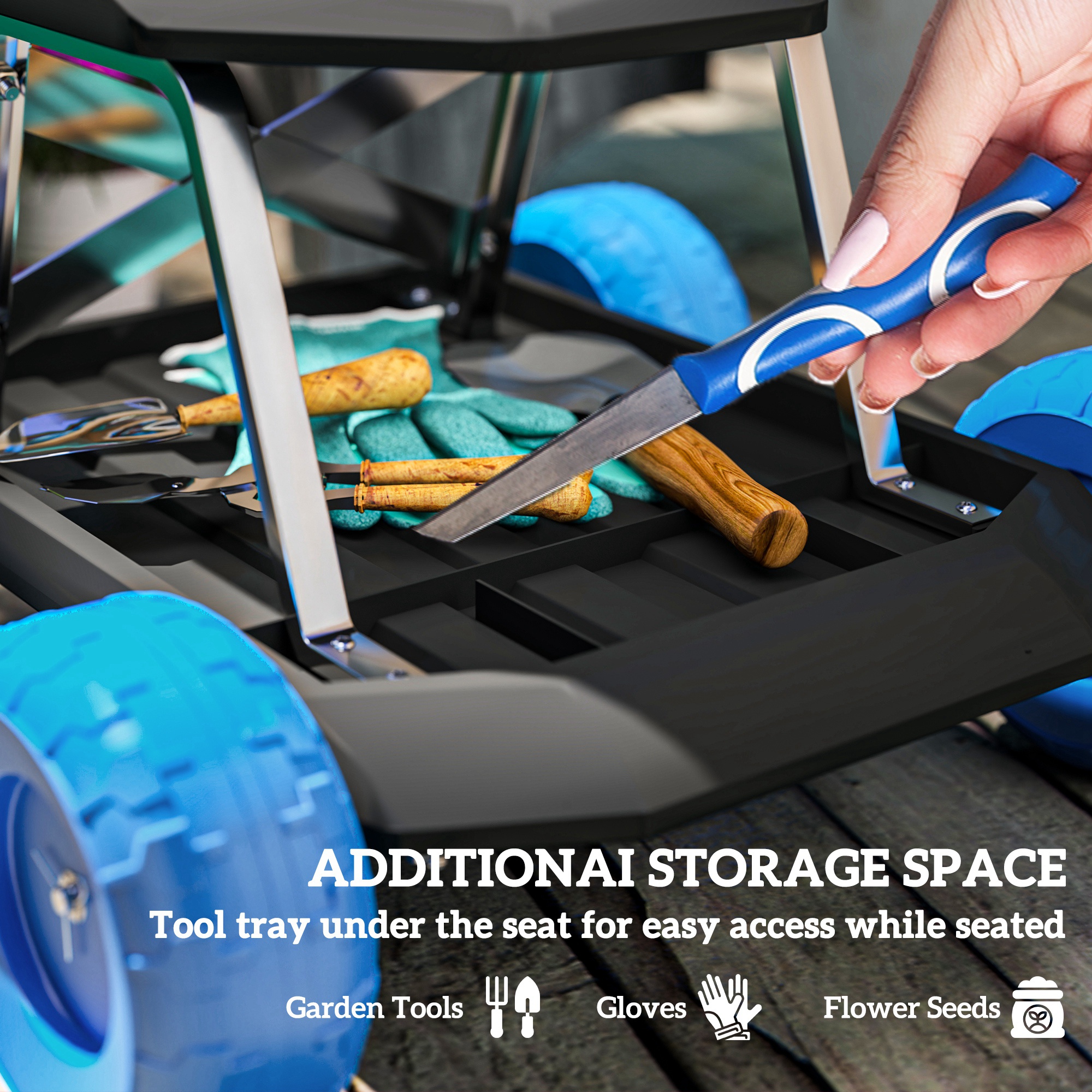 Gardening jobs, made easier than before with this Outsunny cart. It combines an elevated seat, to carry out gardening tasks, with a bottom tray for handy and close-by storage of tools. The extra-wide, plastic wheels glide smoothly over any terrain - making it super easy to move whenever you need.