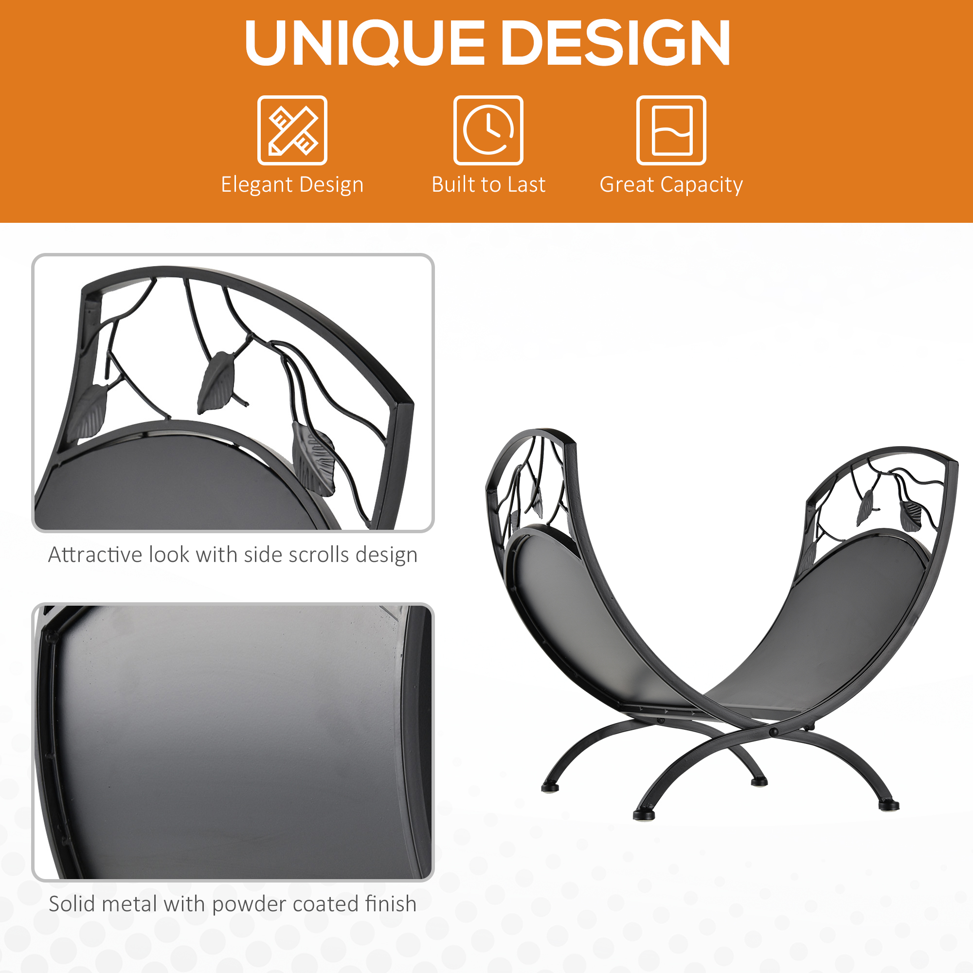 This fire log holder, from Outsunny, has been made with to keep and display your wood together beautifully. It's crafted from powder coated wrought iron, so it's extremely strong and sturdy, and formed into an open arc design which keeps the wood aerated and fresh - even when full. The shape also ensures the logs are centralised and kept together, which helps utilise the space to its fullest potential. A foldable design which will save space when not in use, it is finished with leaf scrolling on the top panels, giving it an elegant look. A piece which will stand both inside and outside with effortless beauty.