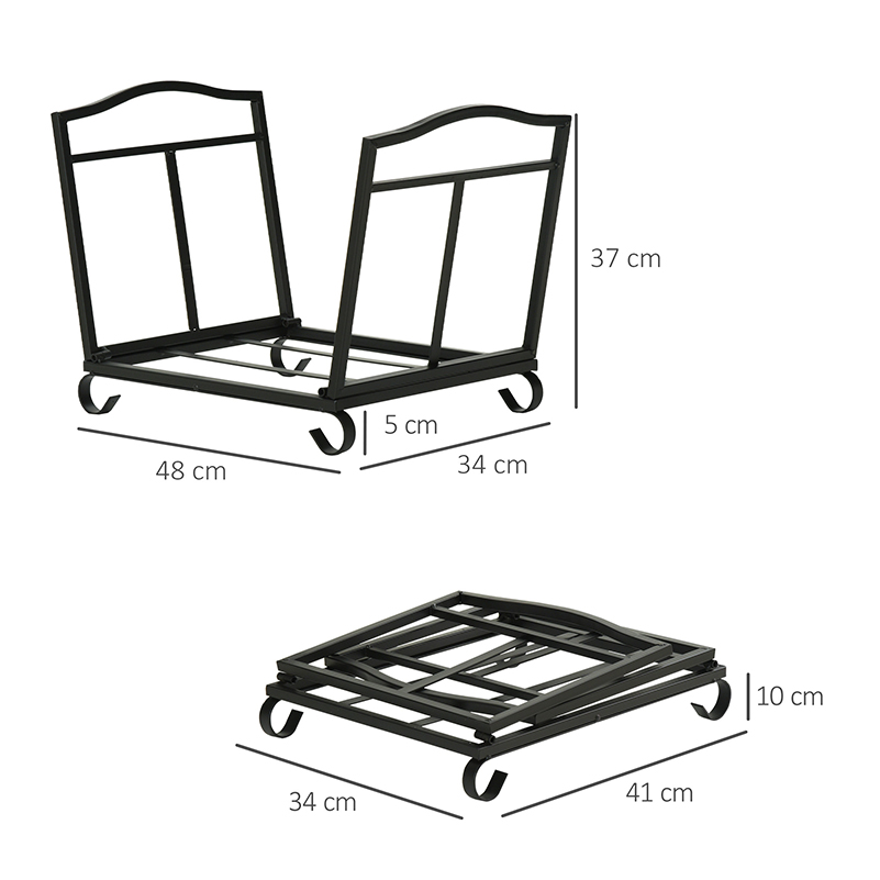 A simple and practical way to store your wood logs starts with this Outsunny log holder basket. Made from powder coated metal for a strong structure, it's made into an open and spacious design to hold lots of wood - up to 50kg worth. Foldable design is easy to store. The bottom shelf is widely slated, so there's no water build up, with four scroll feet elevate it to keep wood aerated - keeping wood stored to maximum burning efficiency. Finished with high sides in a simple line design.