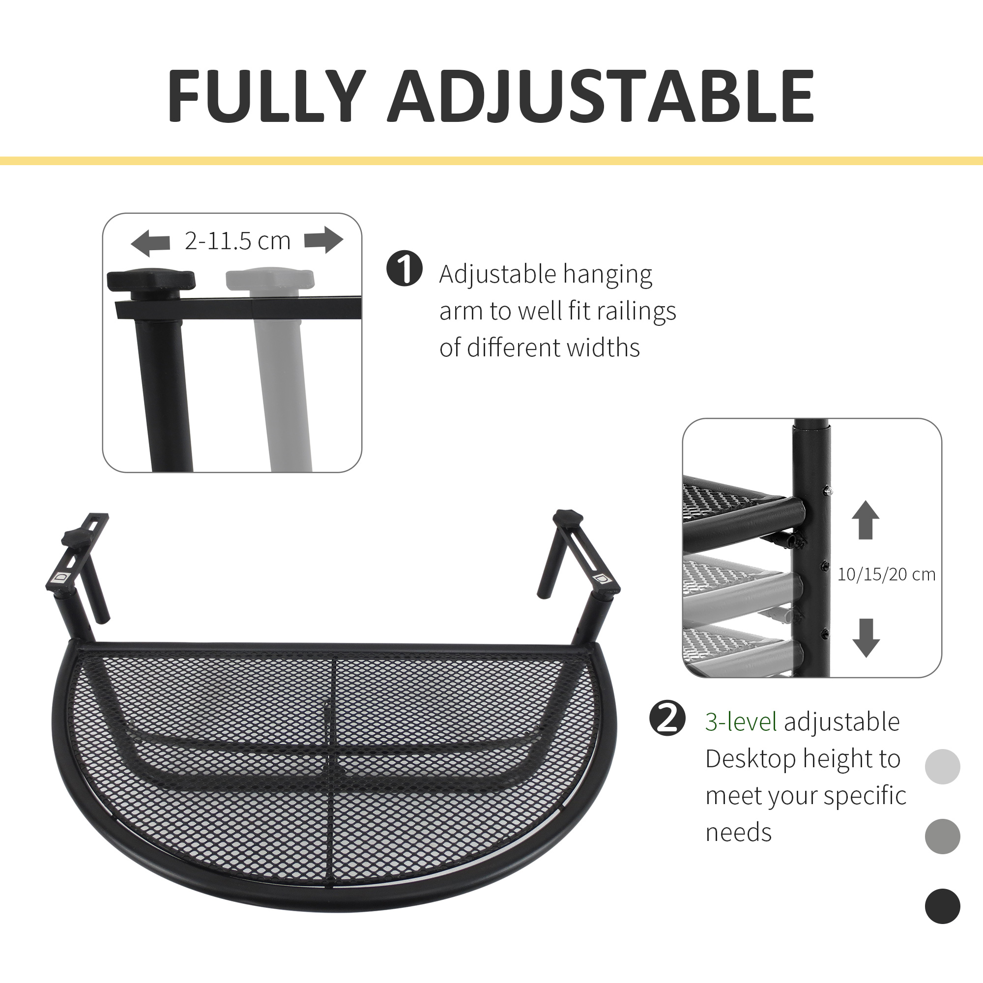 Make the most out of your balcony with this hanging table from Outsunny. Made from high quality metal for durability and strength that holds up to 30kg in weight, it is crafted into a half circle design, allowing it to attach to any balcony with ease. Adjustable to three different height positions, it will cater to suit you and its smooth surface allows it to be cleaned quickly and easily. It’s perfect for enjoying the views with a coffee close.