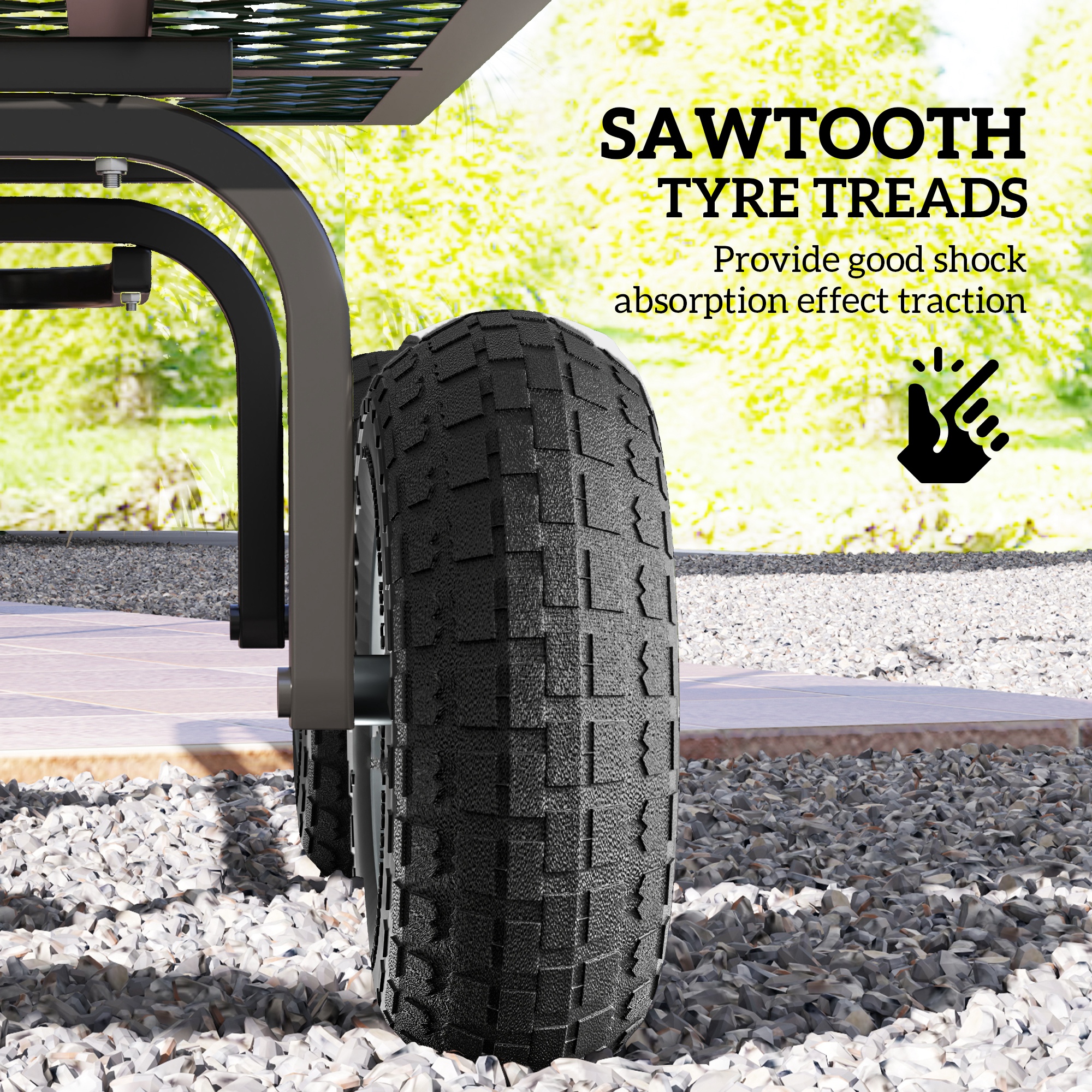 Upgrade your garden tools with this set of 4 Outsunny rubber tires, great for carts, wheelbarrows and trailers. Constructed from robust rubber and metal, these cart wheels measure 25.5 cm in diameter with a 16 mm bore and have an 80 kg weight capacity. Notched treads ensure superior traction across various surfaces.