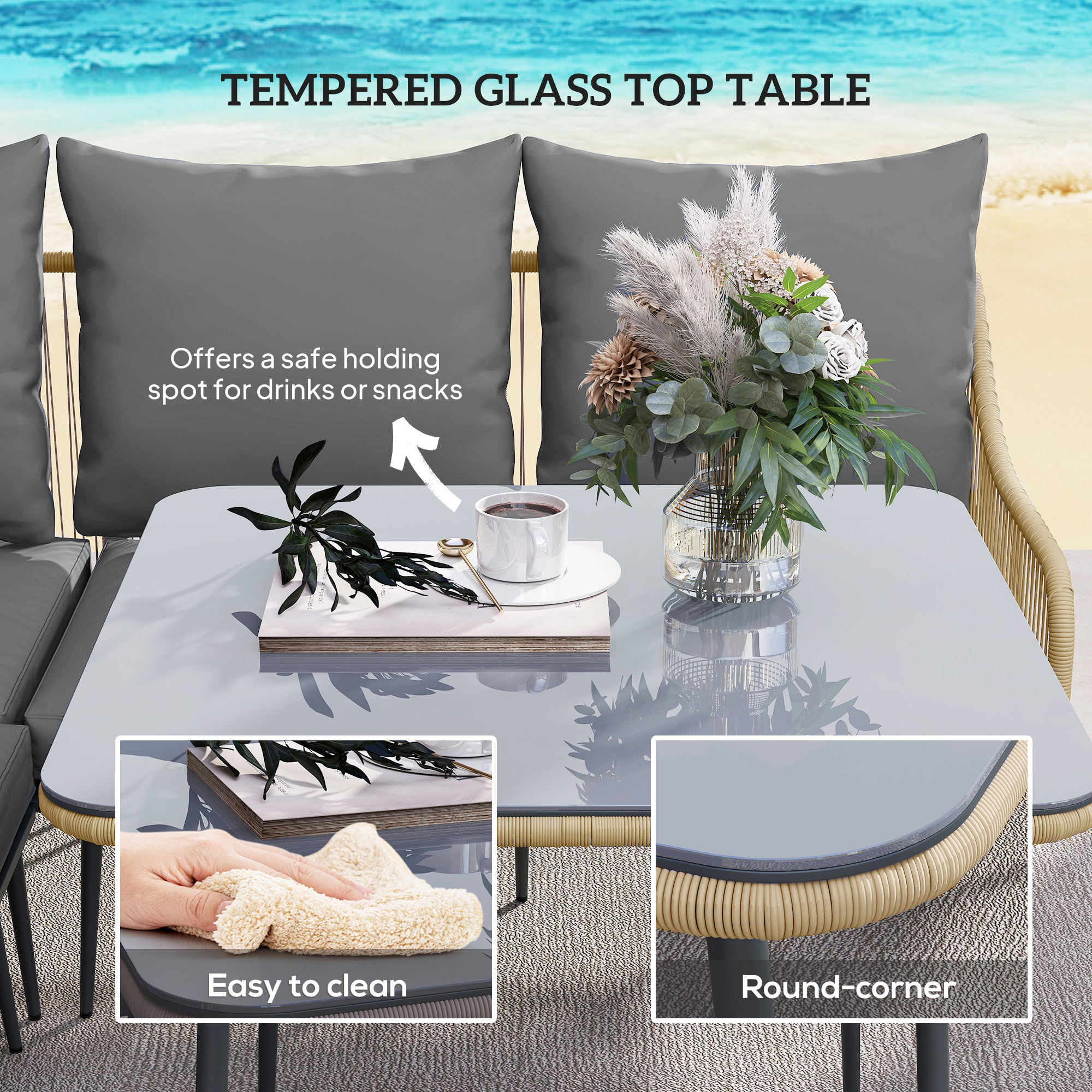 - Materials: Steel, Polyester, Sponge, PE Rattan, PP Cotton, Tempered Glass