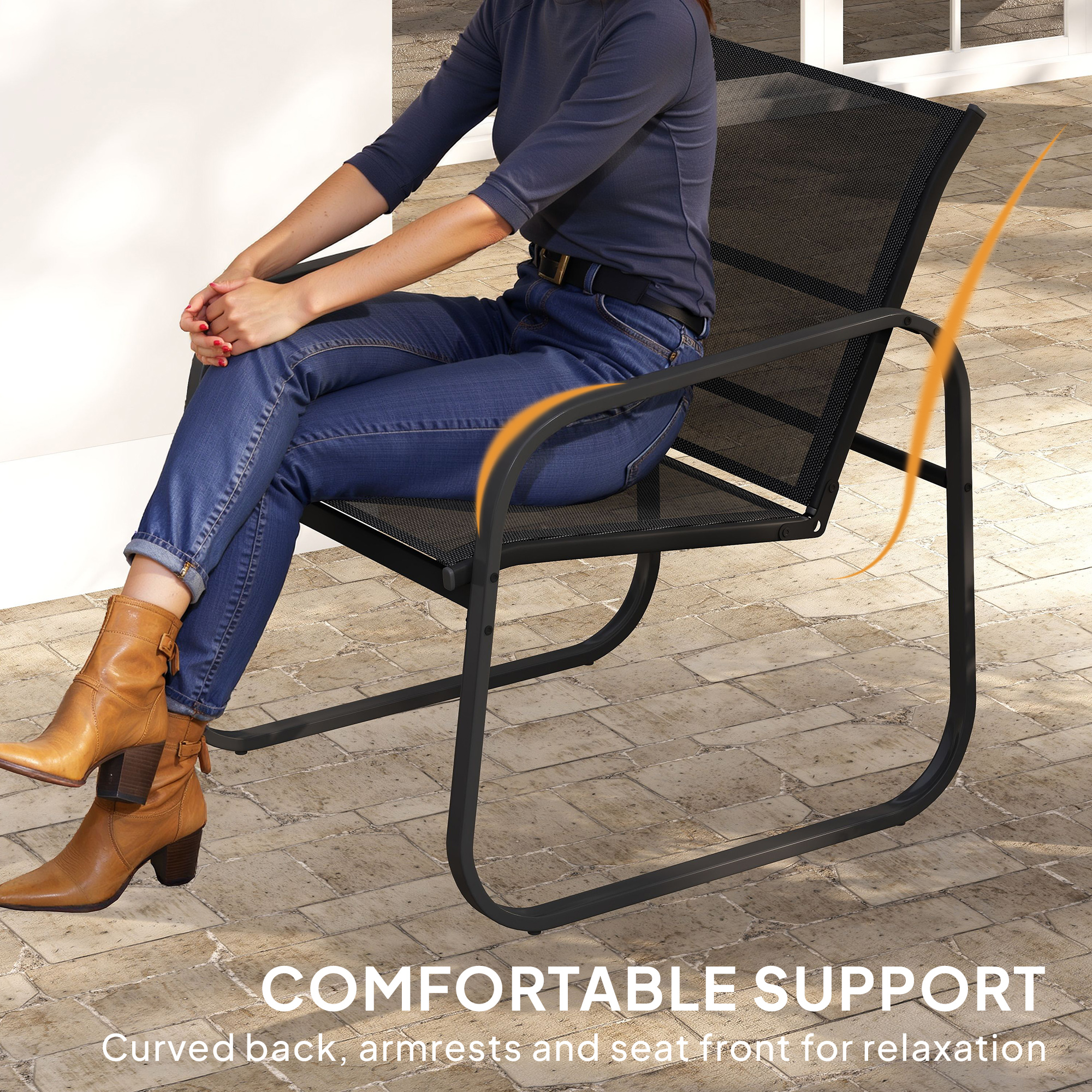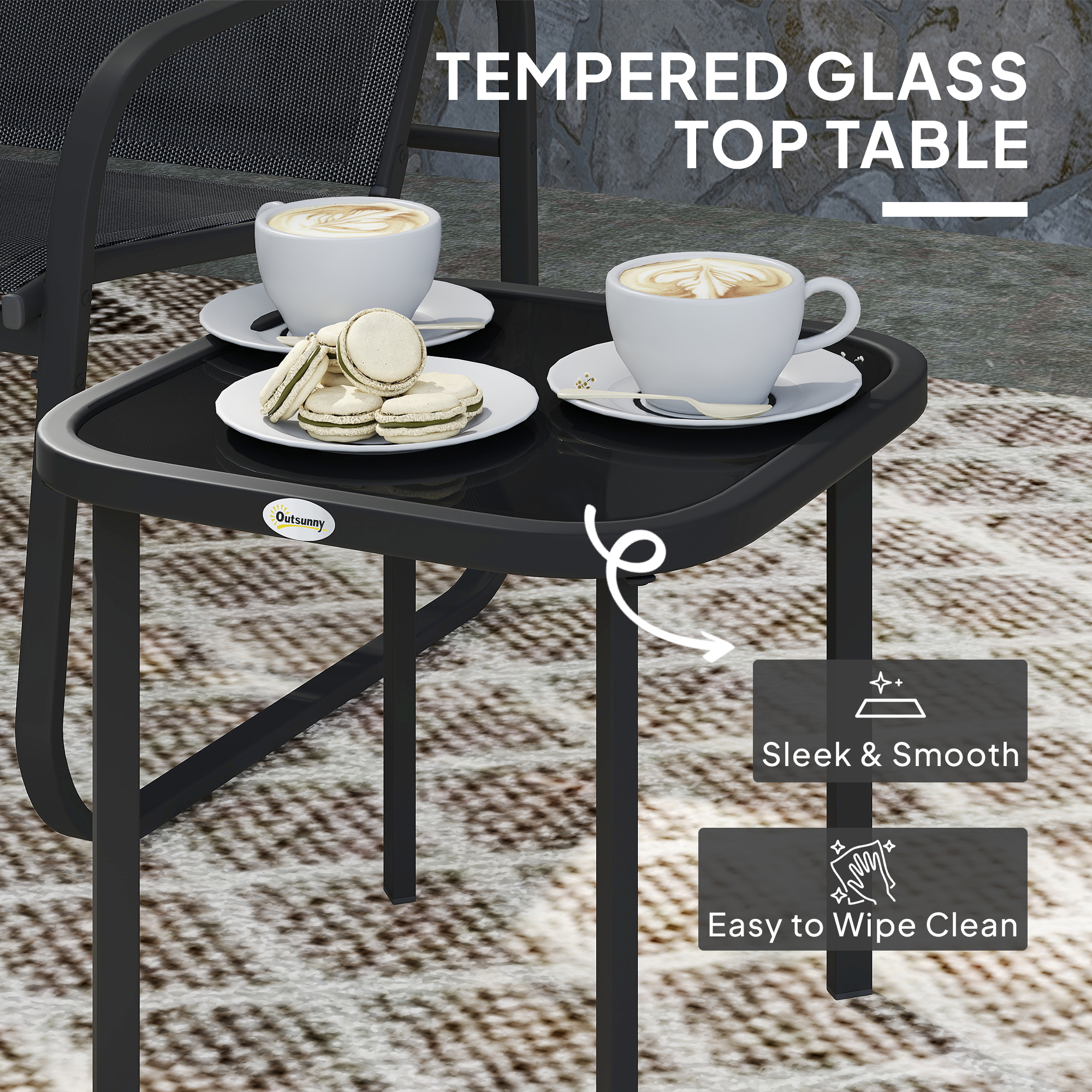For all outdoor spaces, comes this Outsunny three-piece garden table and chairs. It comes with two armchairs and a small square glass-top table: sit with company. The conservatory furniture set is made from powder coated steel, so all patio table and chairs are tough and will support you fully. The texteline panels on the seats and backs help to keep you cool; the chairs come with curved back and armrests to support the body.