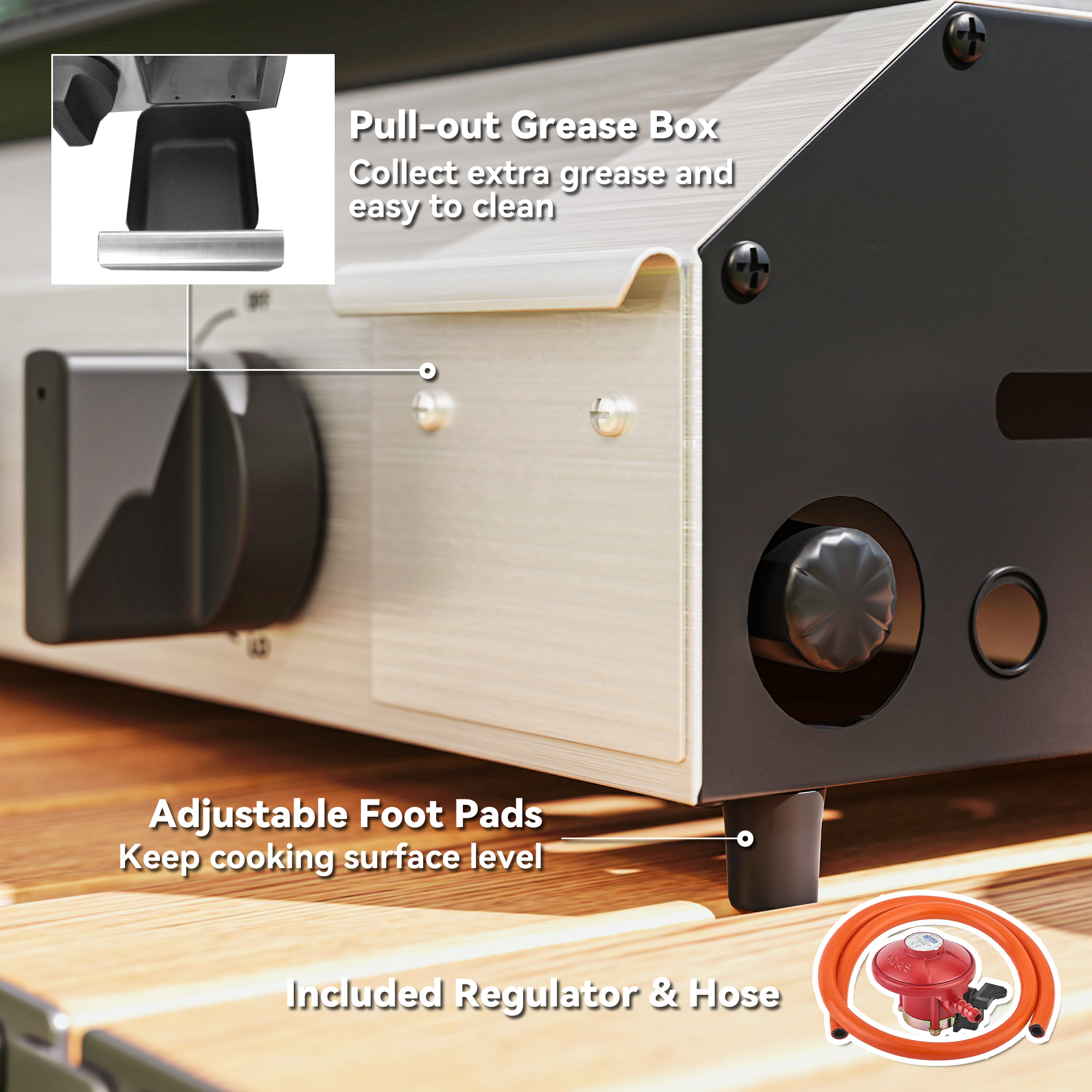 Cook up delicious food, wherever, with this Outsunny portable gas grill. It comes with two adjustable 2.4kW burners: cook different foods at different temperatures - makes it easier to cook a complete meal at the same time. Complete with a pull-out grease collection box for easier cleaning.