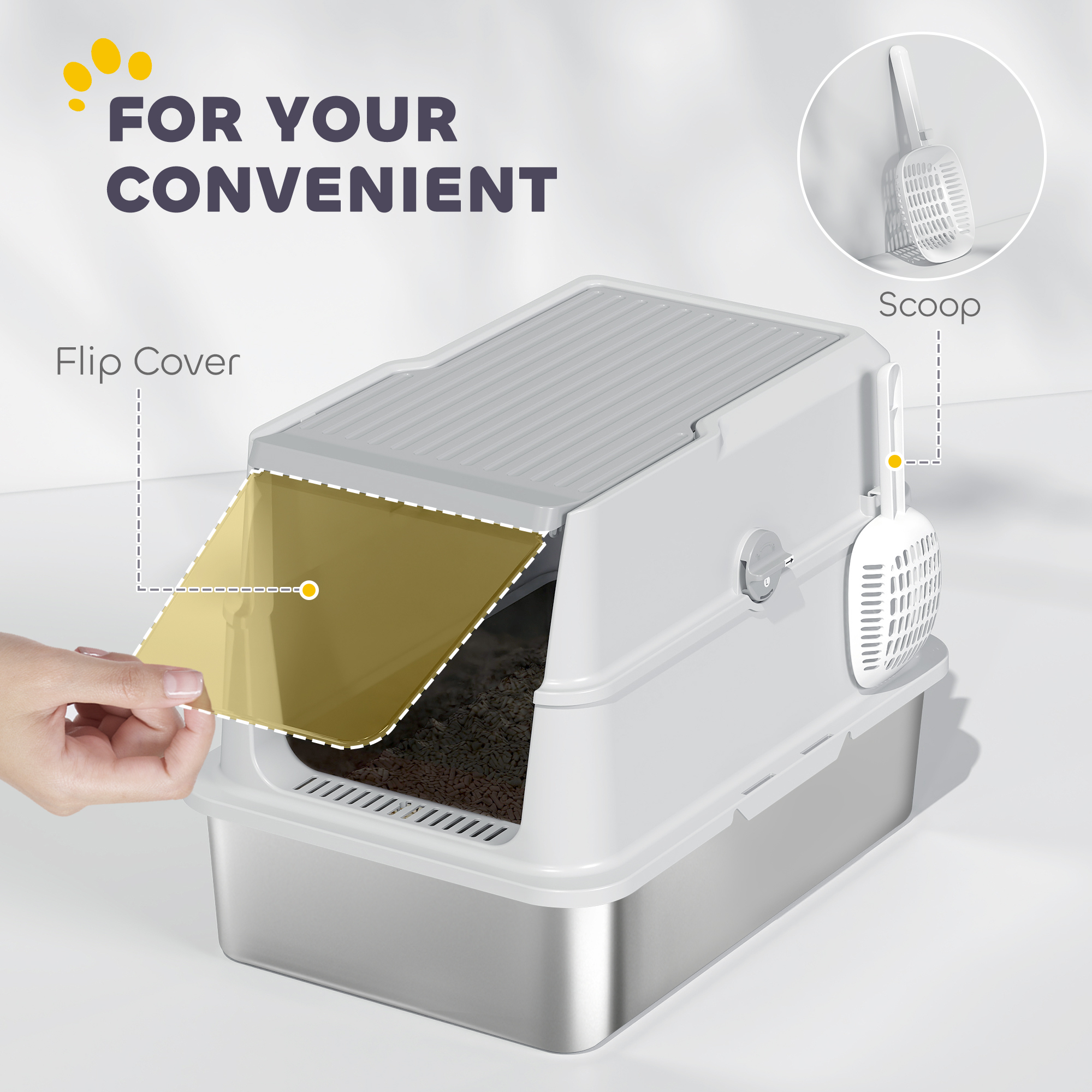 Fed up with scattered litter and lingering smells? The PawHut stainless steel litter box keeps things clean, fresh and easy. Its odour-resistant, scratch-proof tray wipes down in seconds, while the smart front-entry and top-exit design reduces mess. A built-in sand drop area catches stray grainsand with a deodoriser pouch and scoop included, daily clean-ups are quick and stress-free - great for any cat-friendly home.