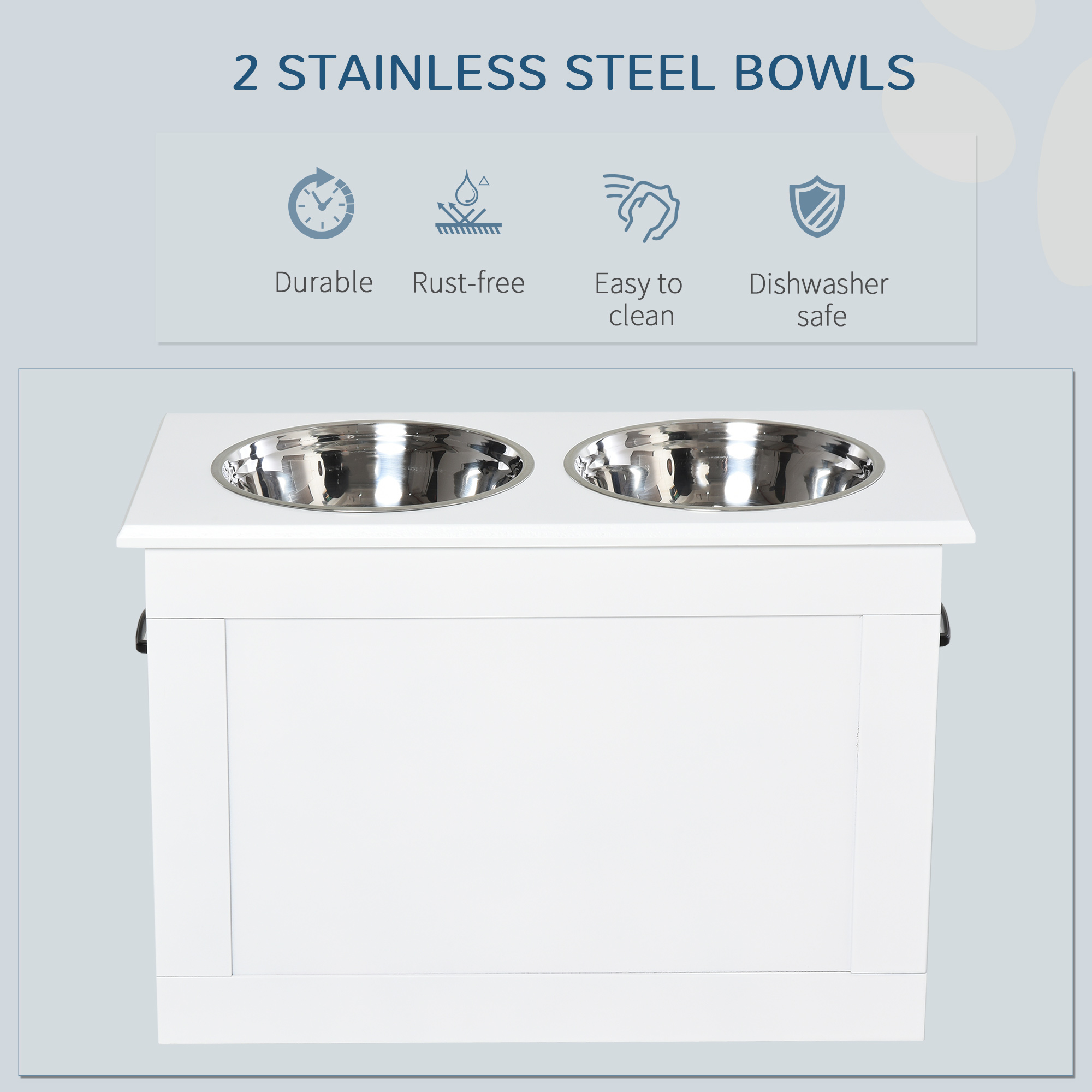 When large dogs bend down to eat and drink, it can strain their neck and back, which can cause health problems in the future. Minimise this risk with PawHut's raised dog feeder, allowing pets to eat and drink comfortably. Two bowls for food and water, which are removable for cleaning. There's hidden storage to keep supplies, so it's quick and easy to refill their bowls. Finished with a sleek design, it compliments your living space perfectly.