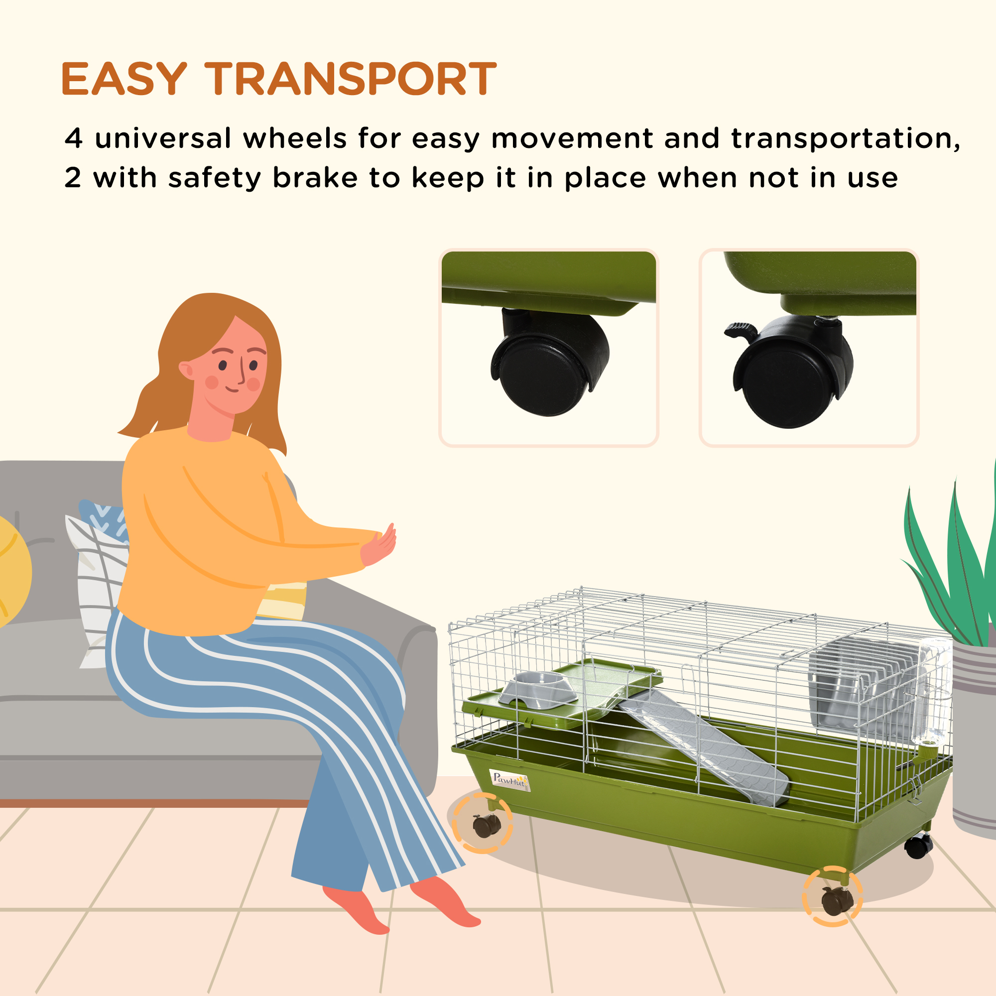 Give your small pet their own place to chill the day away with this cage from PawHut. It's made with a 40x89cm living area, protected by metal wire casing, keeping them safely inside and allowing the air to flow through. Inside features a small platform with a food bowl, a water bottle, a ramp and a hay feeder, giving them everything they need to stay happy, hydrated and fed. With a large front door and top door for easy access, it's finished with a deep base, which collects dirt and debris, and four wheels to move around easily. Perfect for Rats, Hamsters, Chinchillas and more.
