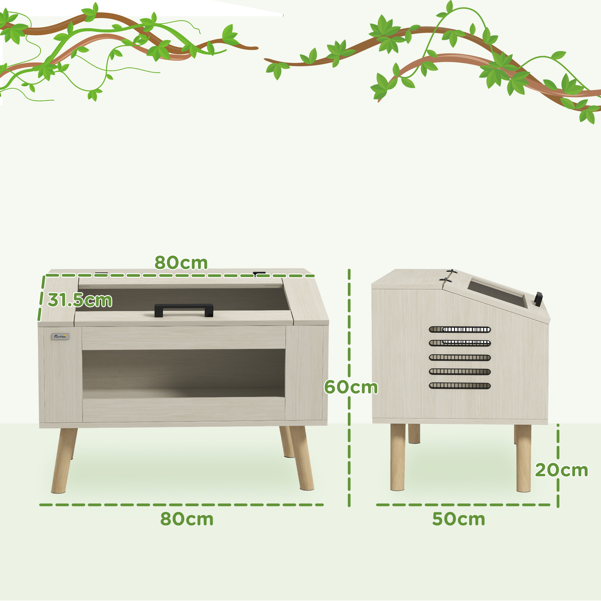 Introduce your tortoise to this charming PawHut outdoor tortoise house. A stable wooden structure, pets will relax in the dual hide boxes, whilst the middle area lets them roam and explore. The clear acrylic window and openable top offer easy access and interaction. Adjust the lamp holder for optimal lighting, getting the temperature just right. A sleek design that fits seamlessly in your home, it's a welcoming abode for pets to thrive and prosper.