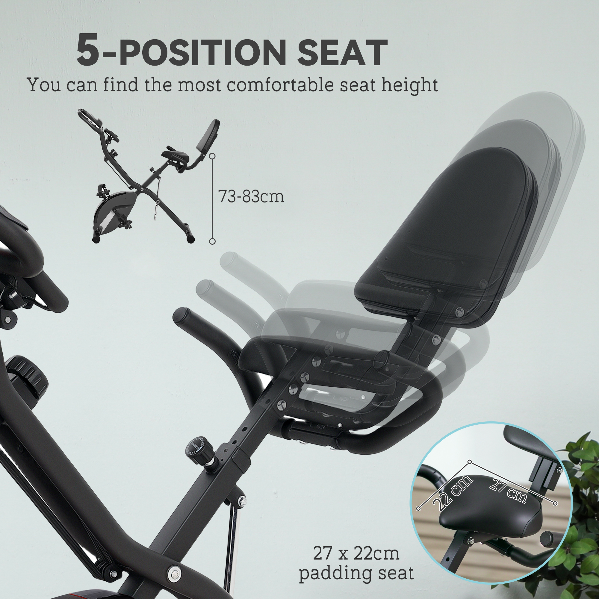 Enhance your fitness with the SPORTNOW foldable bike. Choose from five positions, including recumbent and upright, to tailor your workout. With eight levels of adjustable resistance, you'll control the intensity of a smooth, silent ride. Fold the bike for easy storage and use the built-in wheels for effortless movement. The LCD monitor tracks time, speed, distance and calories, helping you stay on track with your goals. Ready to pedal your way to success?