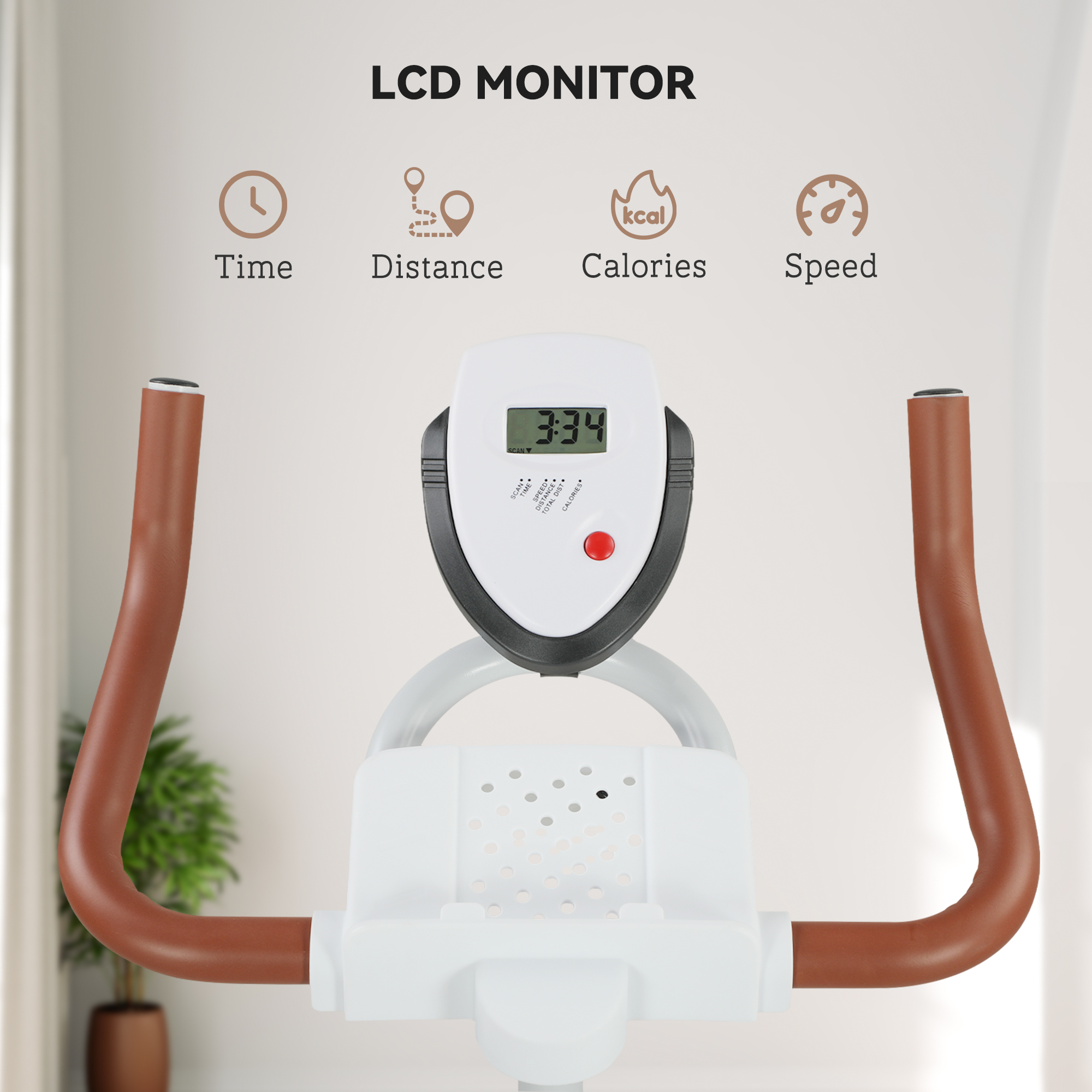 Achieve your fitness goals at home with the SPORTNOW static bike. Adjust the resistance to your comfort level – and increase it as you get stronger for a more intense workout. The seat and handlebar can also be adjusted to fit different heights, ensuring comfort. The LCD display shows time, distance and calories, helping you track your progress. Great for any home gym, its stylish design fits right in, while the built-in wheels make it easy to move wherever you want.