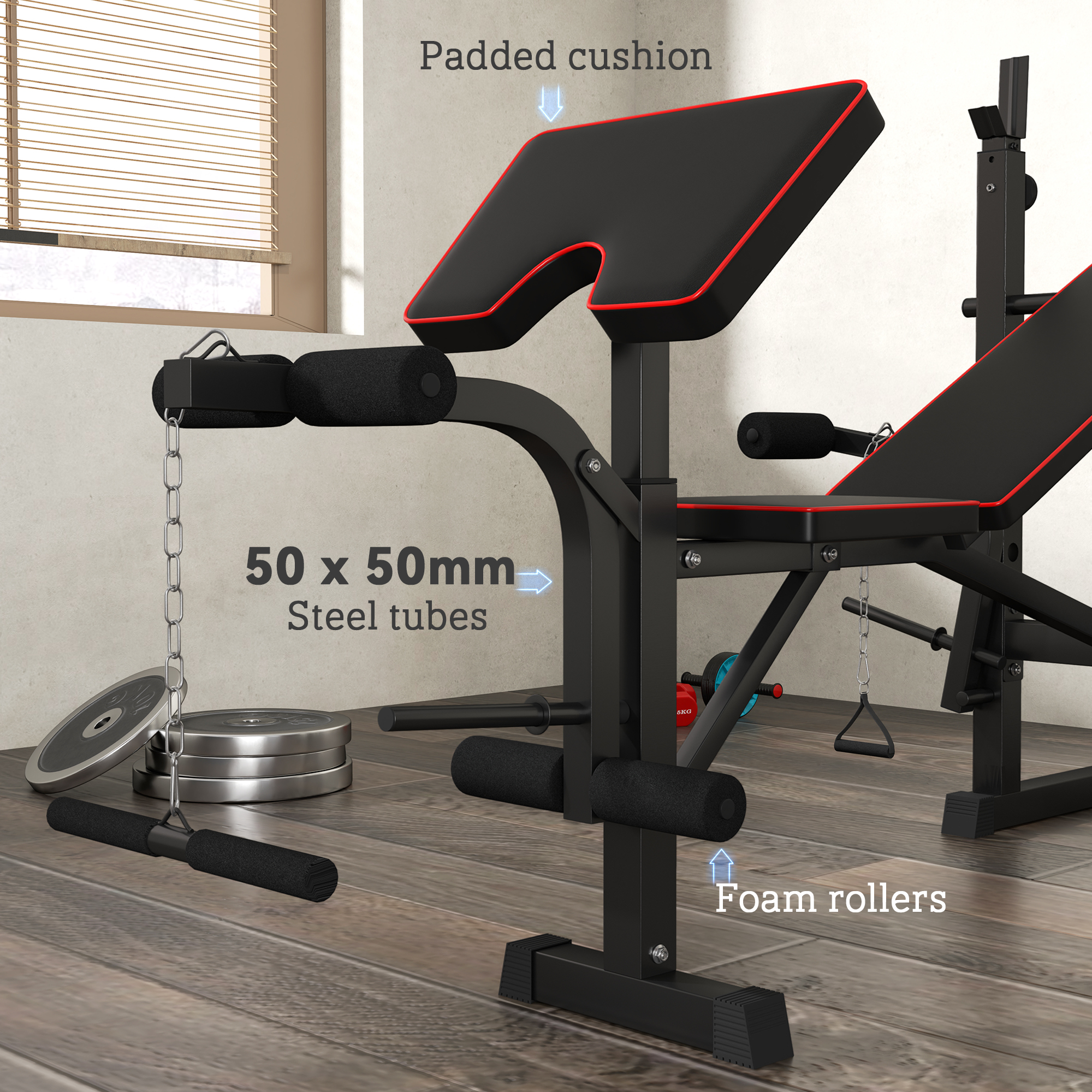 - Multi-position workout bench enhances flat and incline exercises