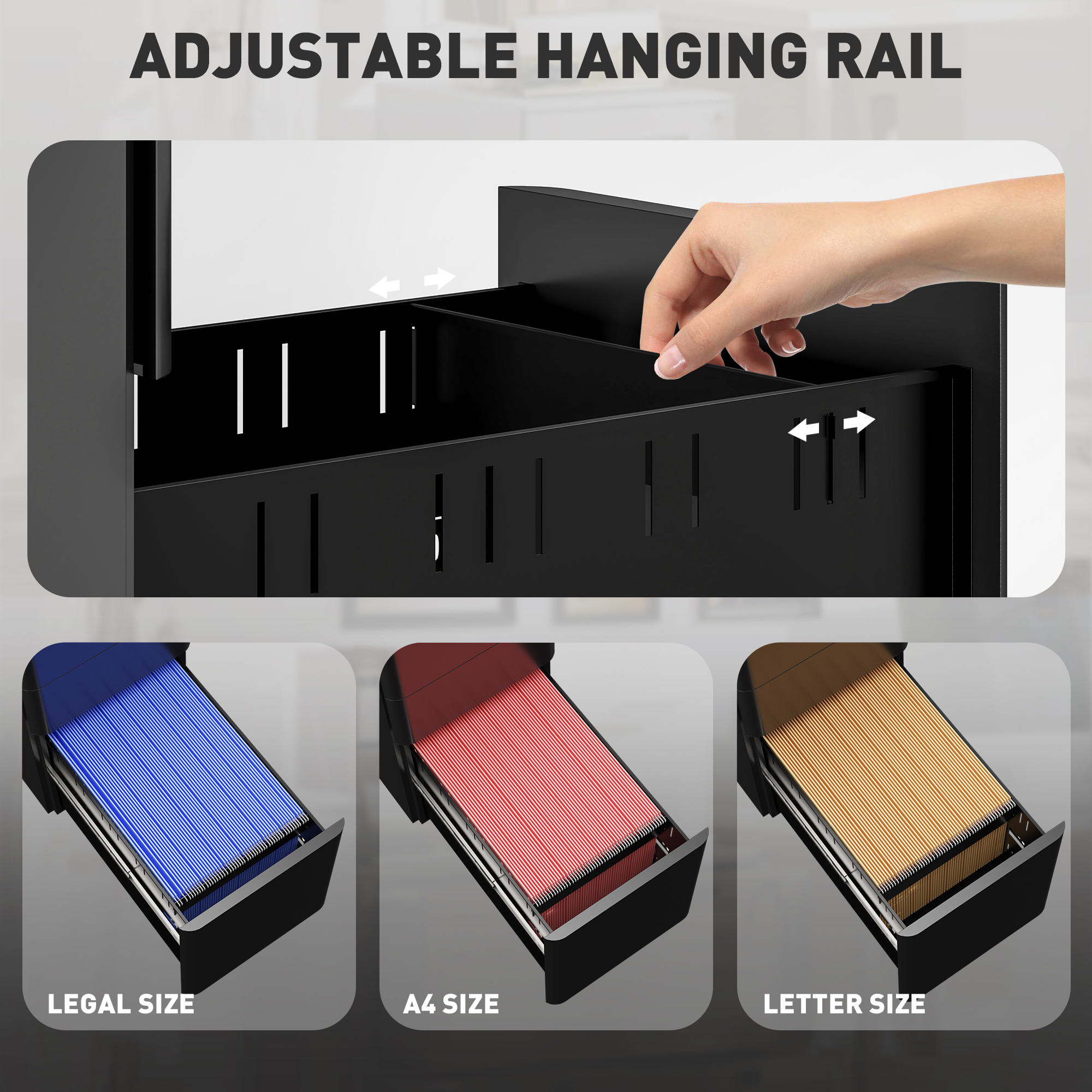 - Large drawer with adjustable rail adjusts to fit A4, legal and letter files