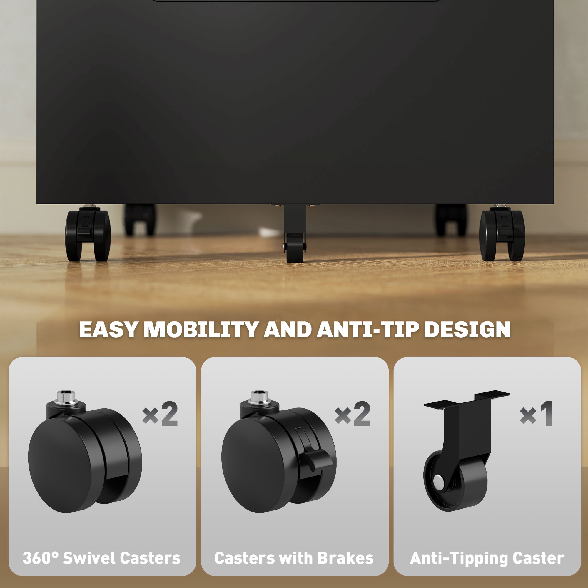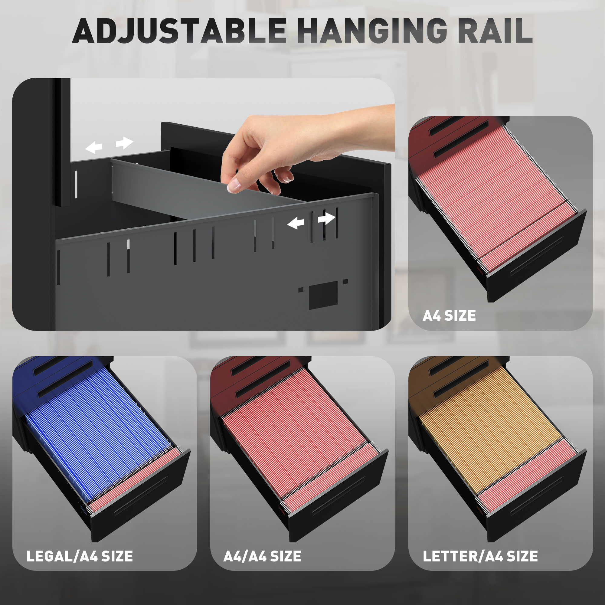 Easy office organisation, in a protective shell, with this Vinsetto filing cabinet. A compact design to fit snuggly underneath your desk, it features two small drawers with a removable pencil tray and a large drawer - plenty of space for files and more. The bottom rail has an adjustable rail for A4, legal and letter files. Complete with wheels to move unit around easily.