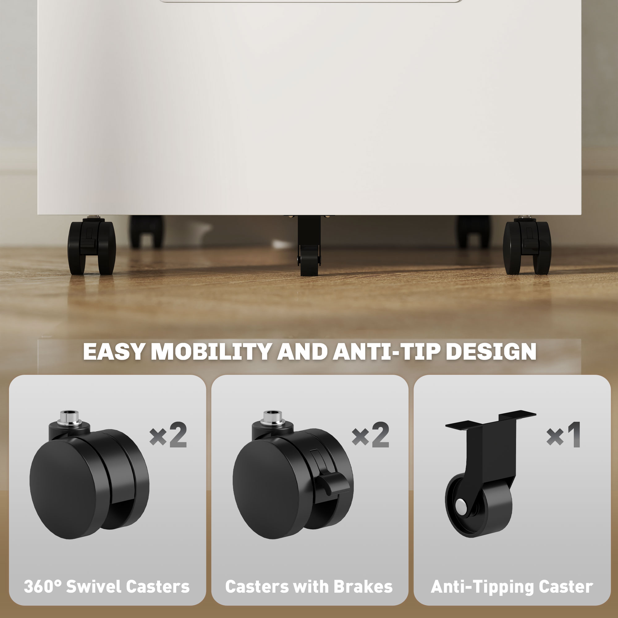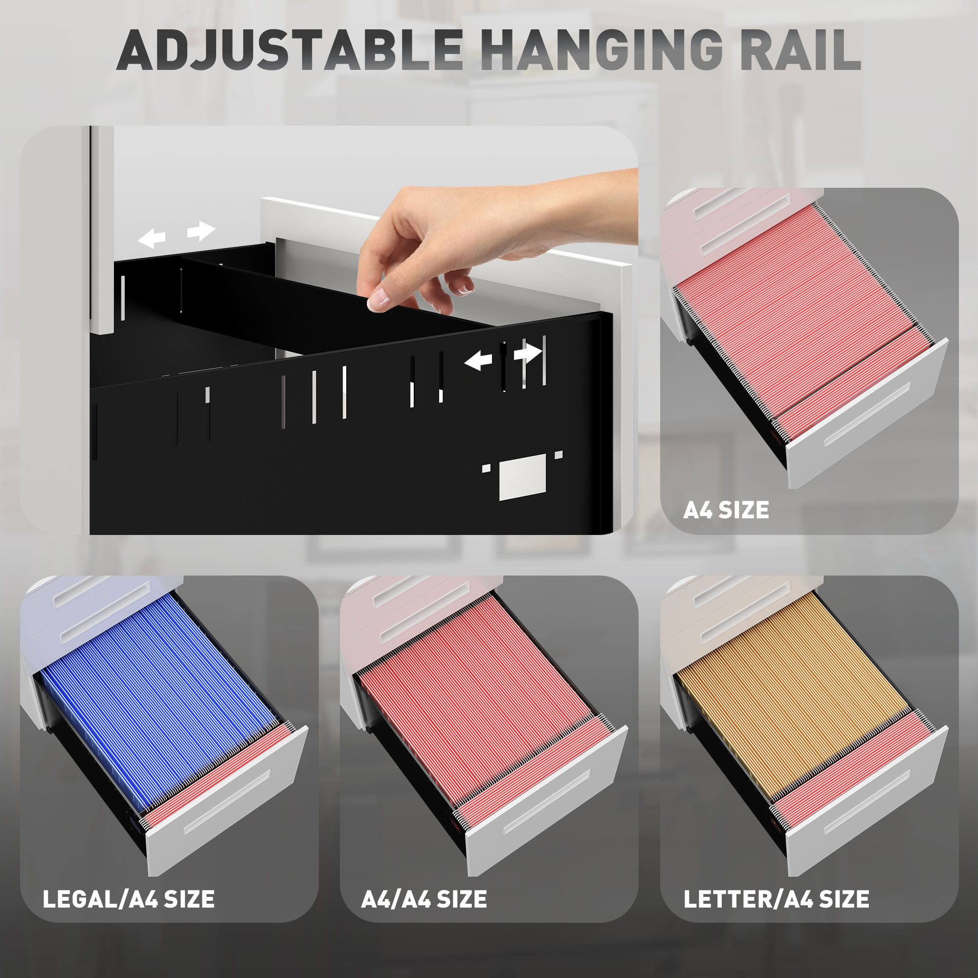 Easy office organisation, in a protective shell, with this Vinsetto filing cabinet. A compact design to fit snuggly underneath your desk, it features two small drawers with a removable pencil tray and a large drawer - plenty of space for files and more. The bottom rail has an adjustable rail for A4, legal and letter files. Complete with wheels to move unit around easily.