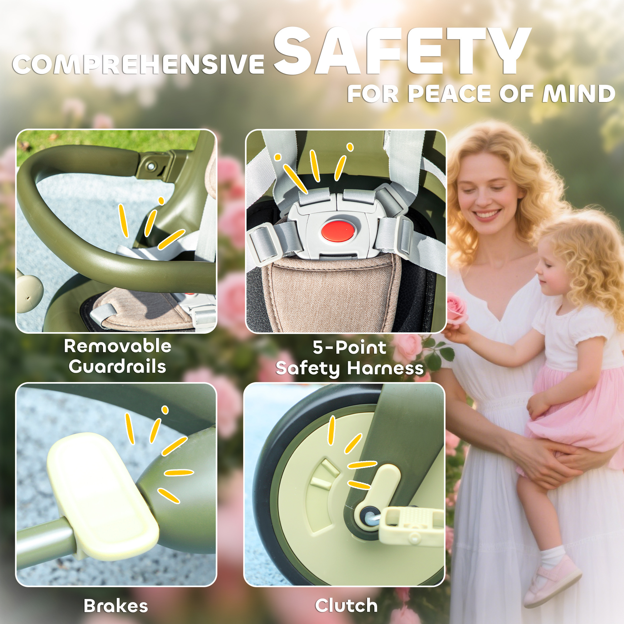 Navigating family outings with ease, the AIYAPLAY baby trike transforms effortlessly between parent-steering, guided trike tricycle modes and bike modes. Safety is paramount with a five-point harness and removable safety bar, giving your little adventurer peace of mind. The adjustable push handle on this kids trike offers comfort for parents while fostering independence in children. Embrace joyful journeys with this versatile tricycle, designed for seamless transitions and secure travels.
