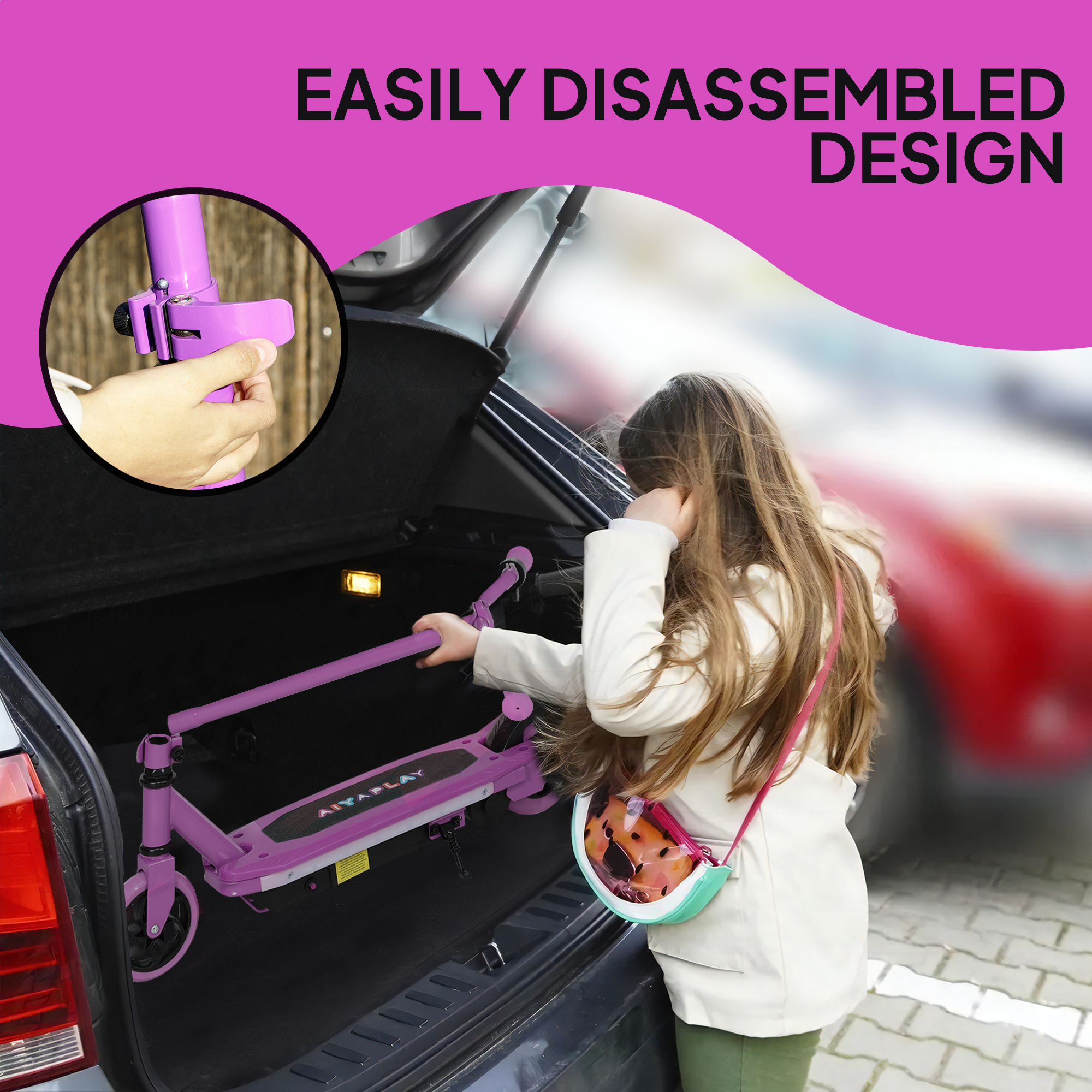 Scoot with pure joy thanks to the AIYAPLAY electric scooter! The safe thumb-throttle lets you control the speed, reaching up to 10km/h. Dynamic light bars at the bottom add excitement to every ride while keeping you visible. Electronic rear brake ensures full control and safe stops. Charge it for just 4-5 hours, so kids can zoom around and have fun!