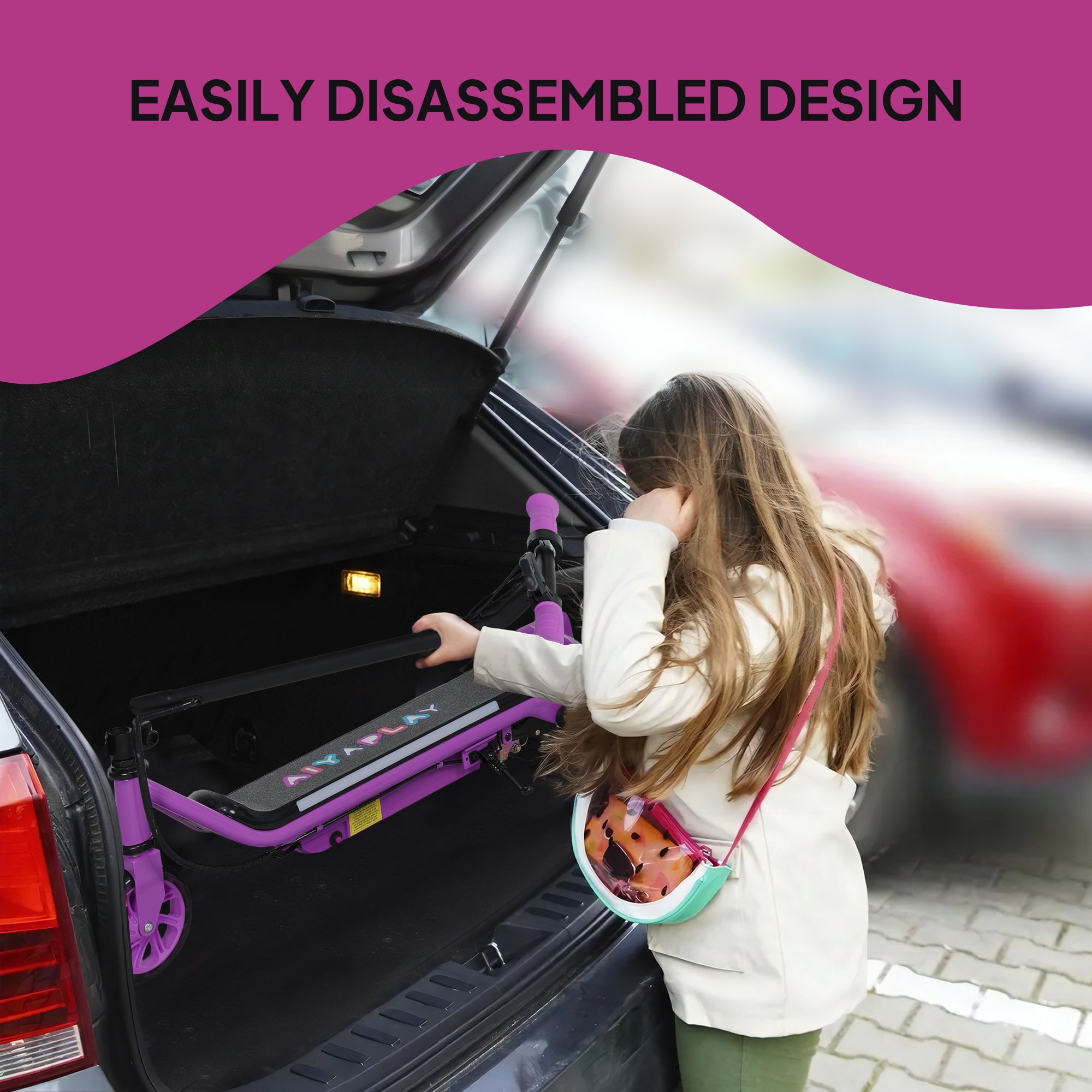 Scoot with pure joy thanks to the AIYAPLAY electric scooter! The safe thumb-throttle lets you control the speed, reaching up to 12km/h. Dynamic light bars at the bottom and an illuminated front wheel add excitement to every ride while keeping you visible. Two brakes with brake lights ensure full control and safe stops. Charge it for just 5-8 hours, so kids can zoom around and have fun!