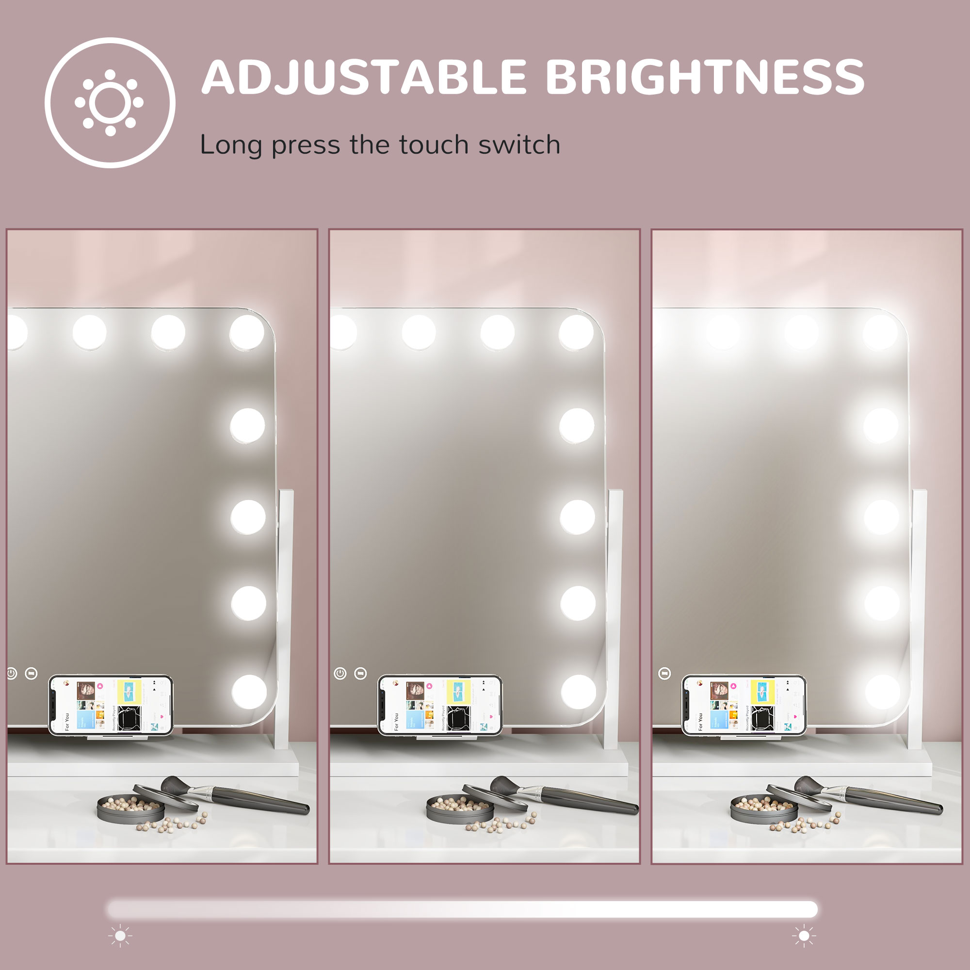 Light up with beautiful illumination any time you want, thanks to this HOMCOM LED vanity mirror. The 14 LED bulbs provide 50,000 hours of illumination; adjust the colour between warm, cool and natural light and change the brightness - how you want it is completely in your control. With a phone holder and USB port, keeping your device next to you is effortless.