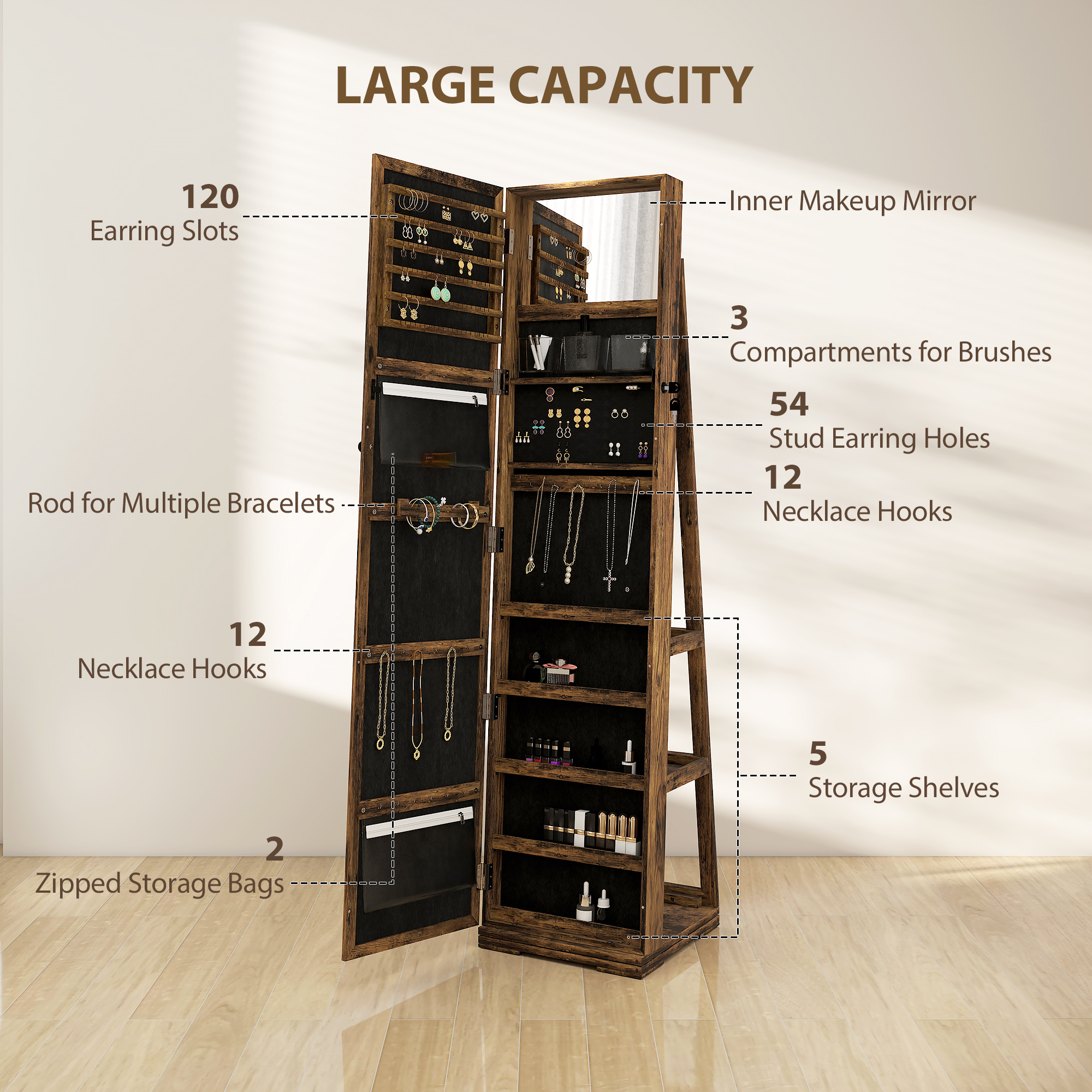 - Inside features multiple earring slots, necklace and bracelet hooks, ring slots and shelves