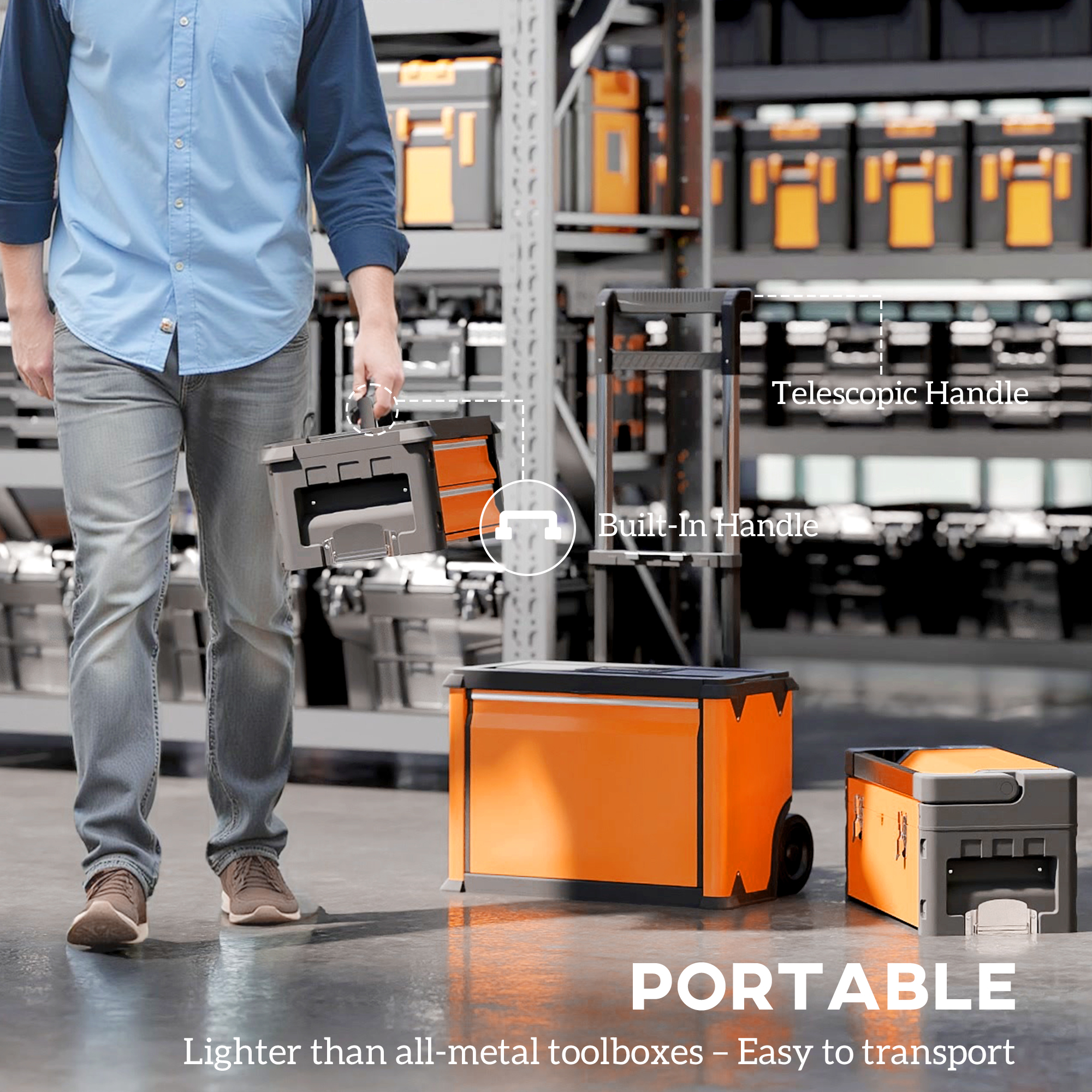 - Lightweight design (compared with all-metal construction), with handle for easy transportation