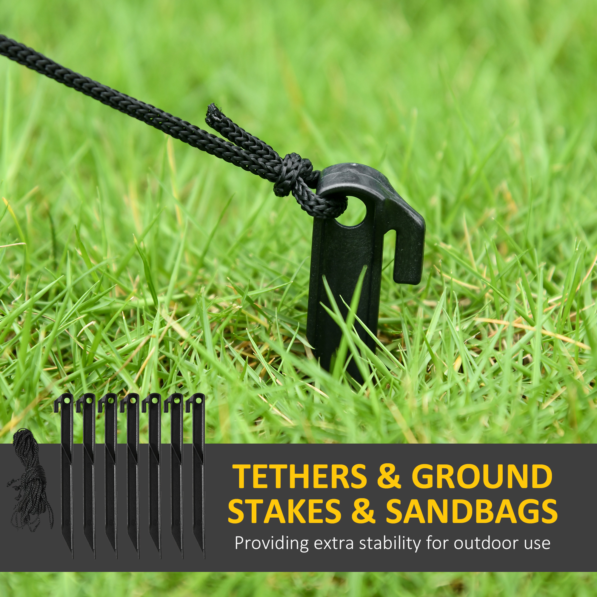 - Seven ground stakes, three guy ropes and a sandbag to pin to ground