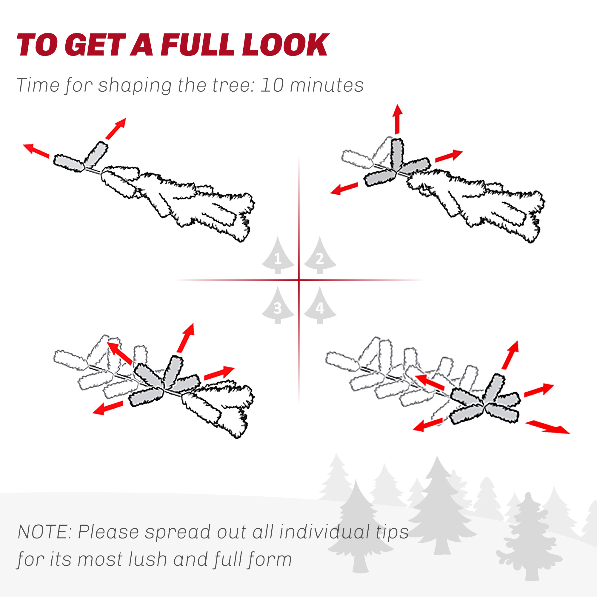- In order to get a full appearance, please spread out all individual tips to get the best possible look from the tree, suggest you to take 10 minutes to shape the tree.