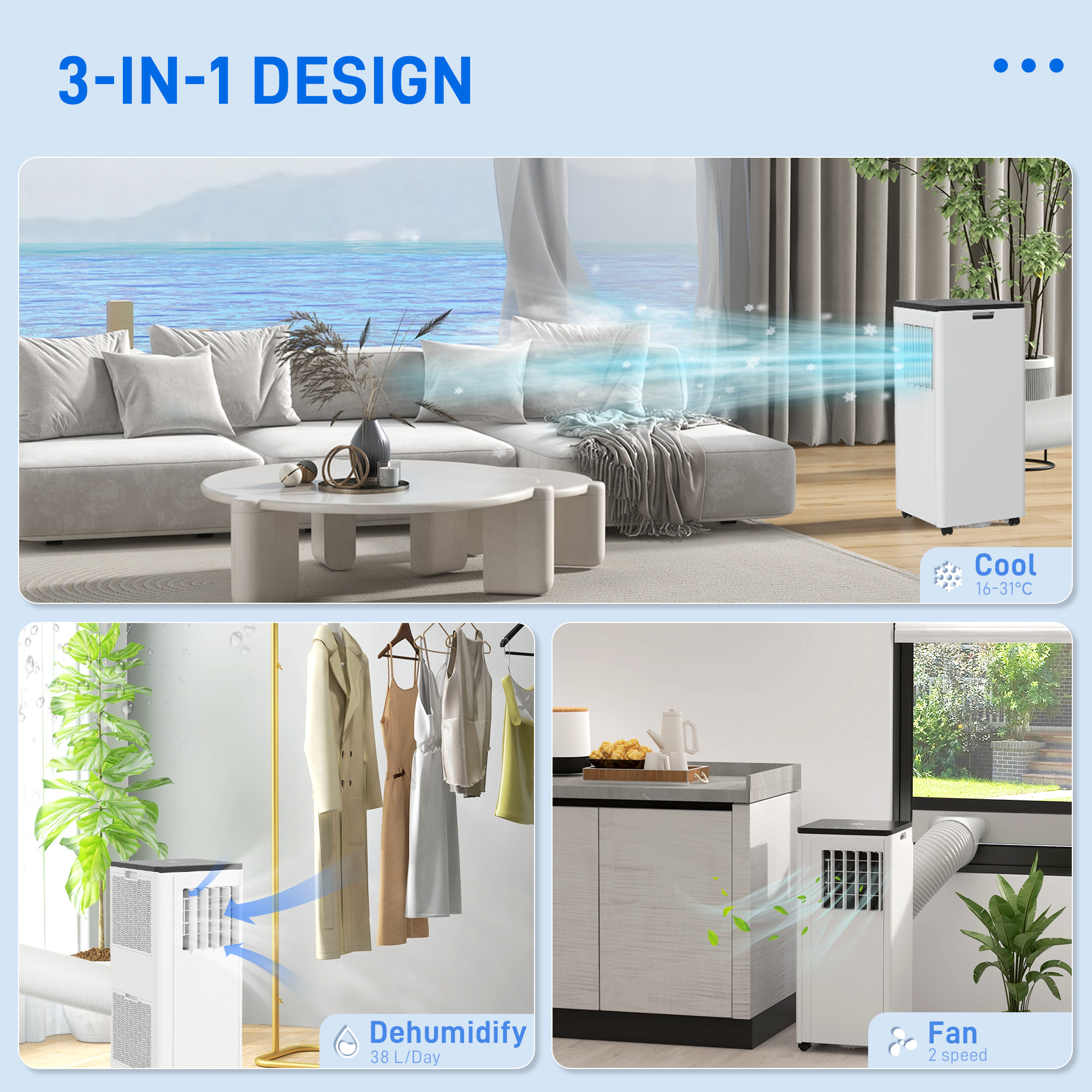 - 3-in-1: Cools, dehumidifies, fans and sleeps