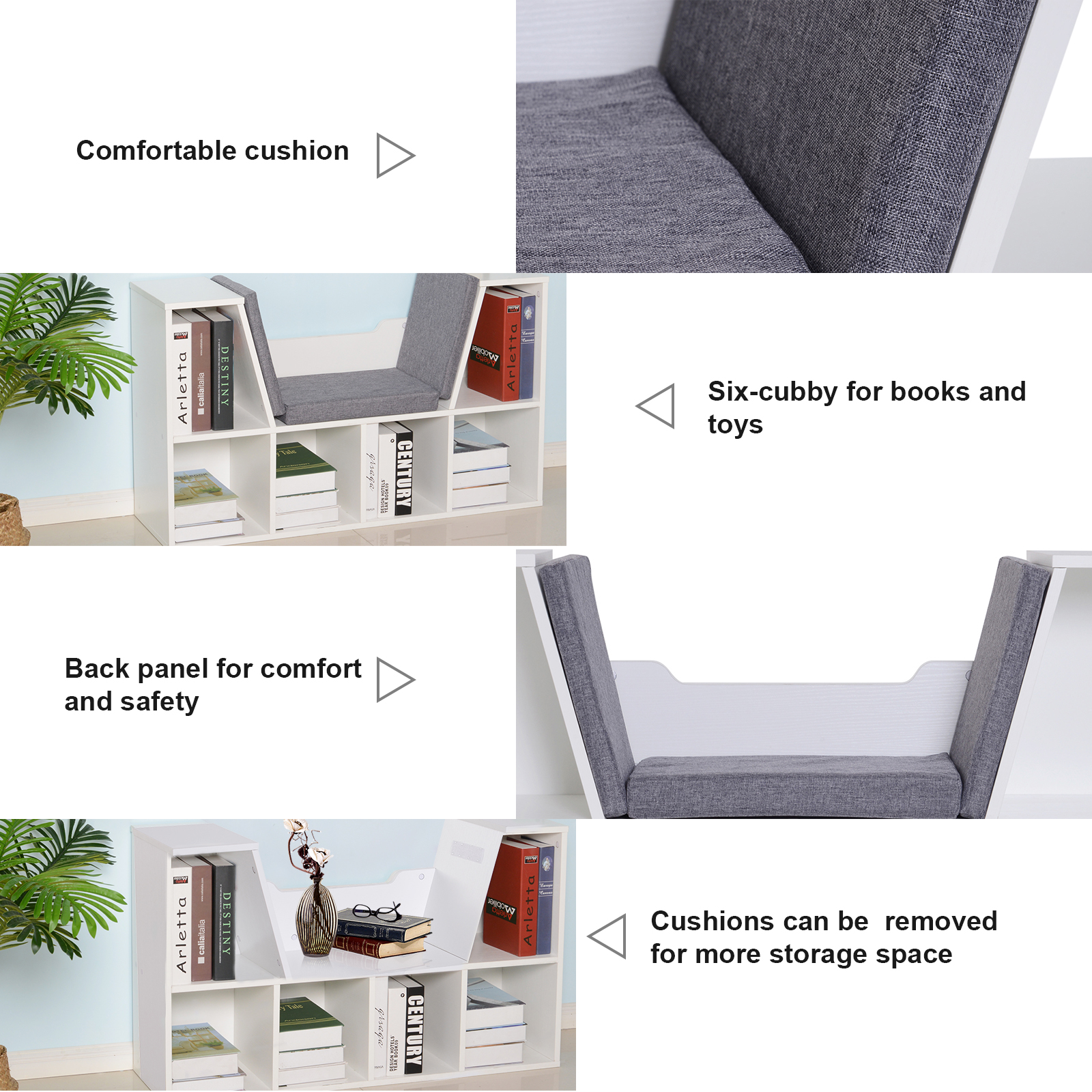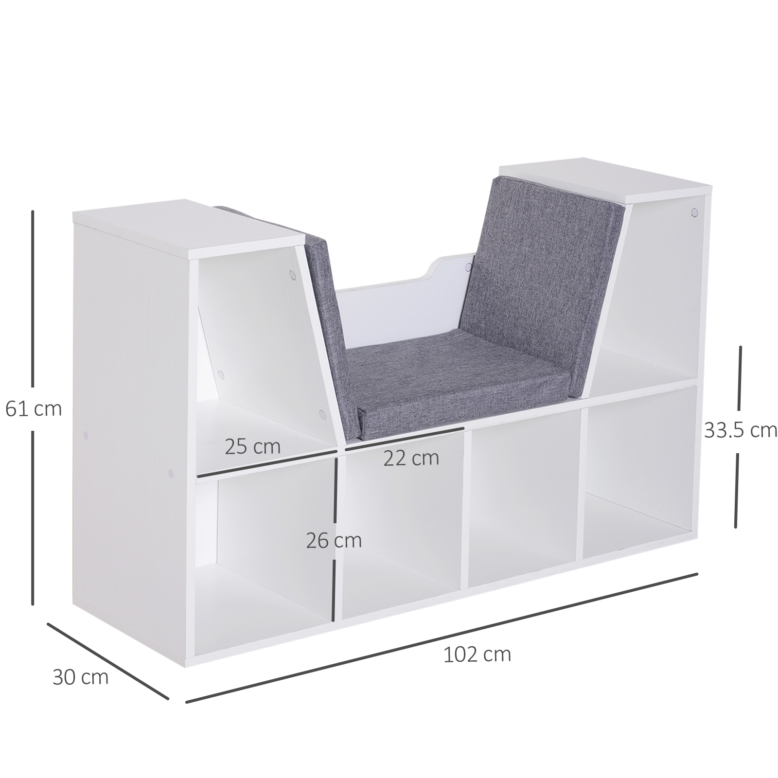 - Unique design combining a seat with a bookshelf/storage unit