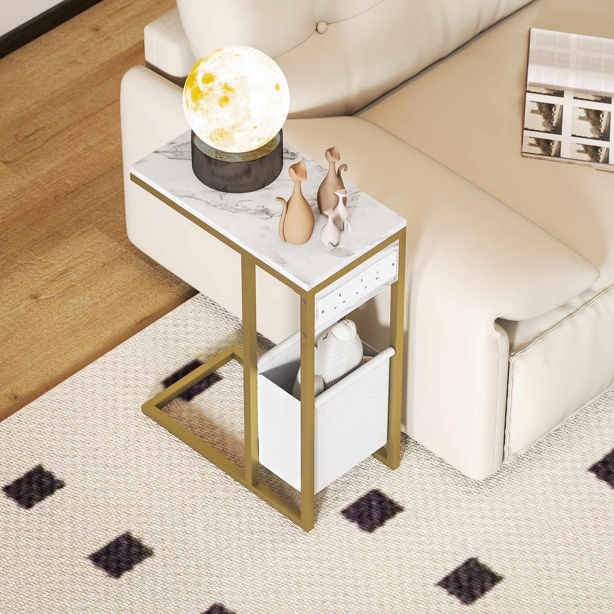 Discover the convenience of our HOMCOM side table, featuring two power outlets, two USB ports and a USB-C port. Its C-shaped elegance, adorned with faux marble panels and gold-tone steel, enhances any space. Enjoy the broad tabletop and a chic fabric storage bag below. A stylish and practical choice, whether used as a nightstand, end table, or sofa side table.