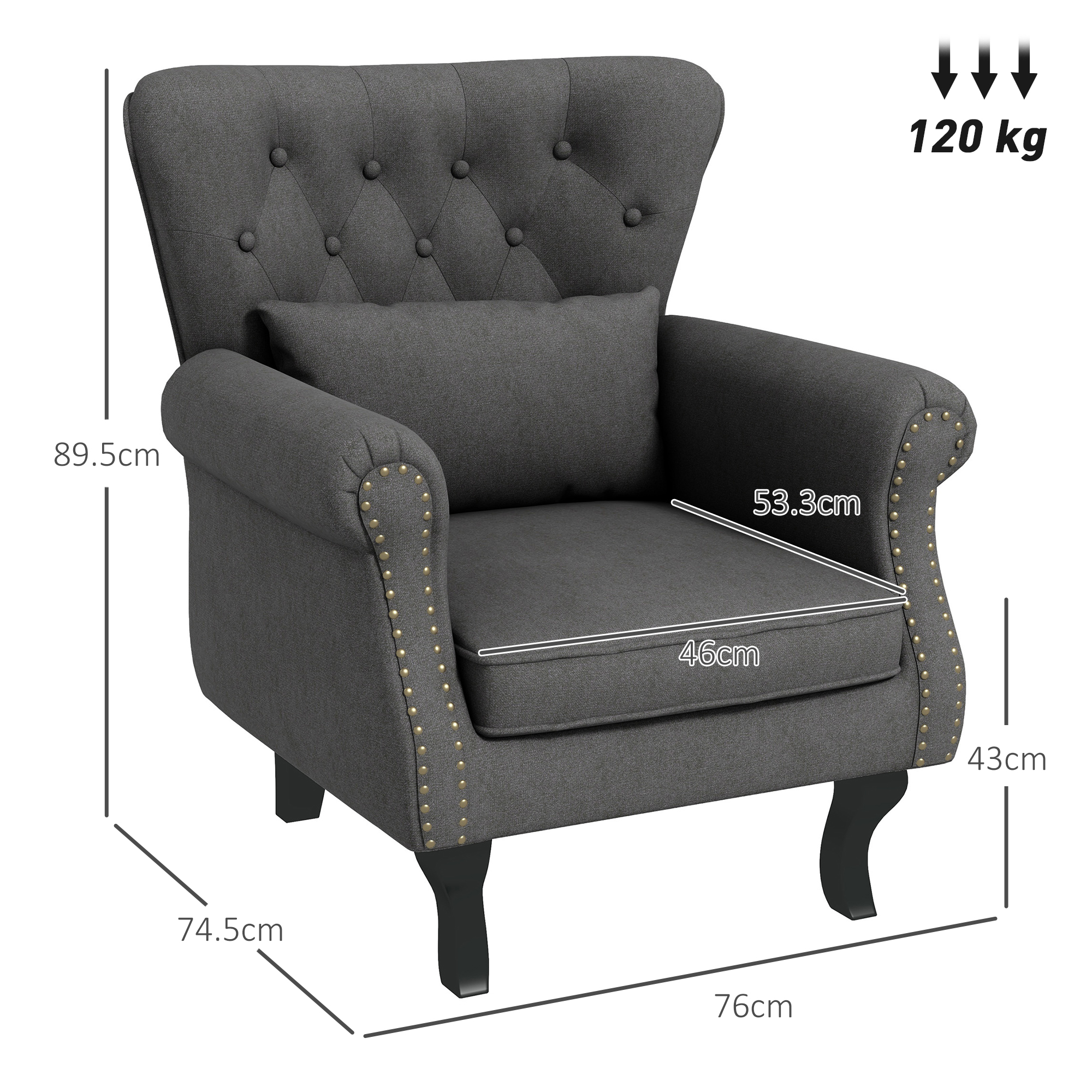 For all over the home, this comfy chair from HOMCOM is a place to relax whenever you want. Thick padding to sink into, with 'S' springs and elastic band to retain the shape. The wingback chair has button tufting on the back, rolled arms with nailhead trim and curved legs for a stylish Chesterfield-style look.