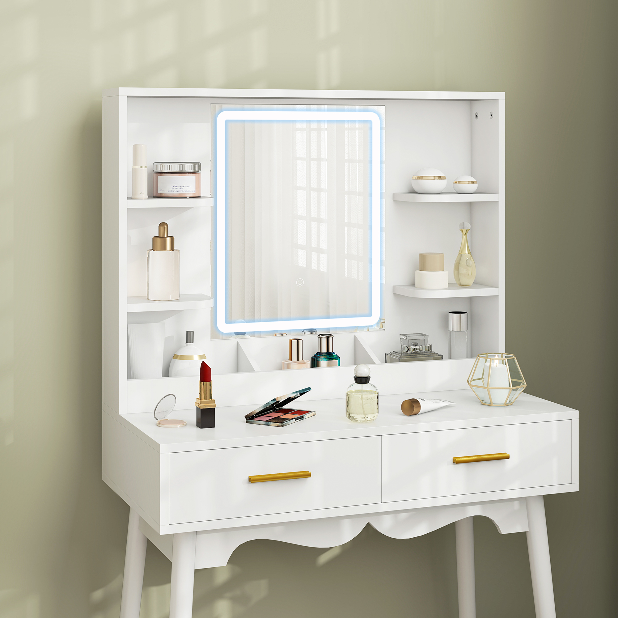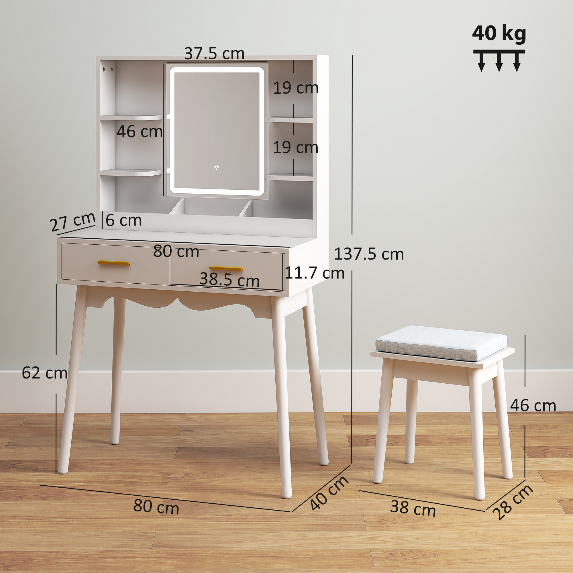 Whatever the time of day, it's easy to get ready with this HOMCOM dressing table. The light is fitted with an outer LED: set the light between the warm, natural or cool white colour, so you'll always be perfectly lighted, no matter the time of the day. It comes in a soft white colour and fitted with gold coloured handles for an elegant design, which looks great in plenty of different home styles. Complete with a padded stool, for you to sit and get ready in comfort.