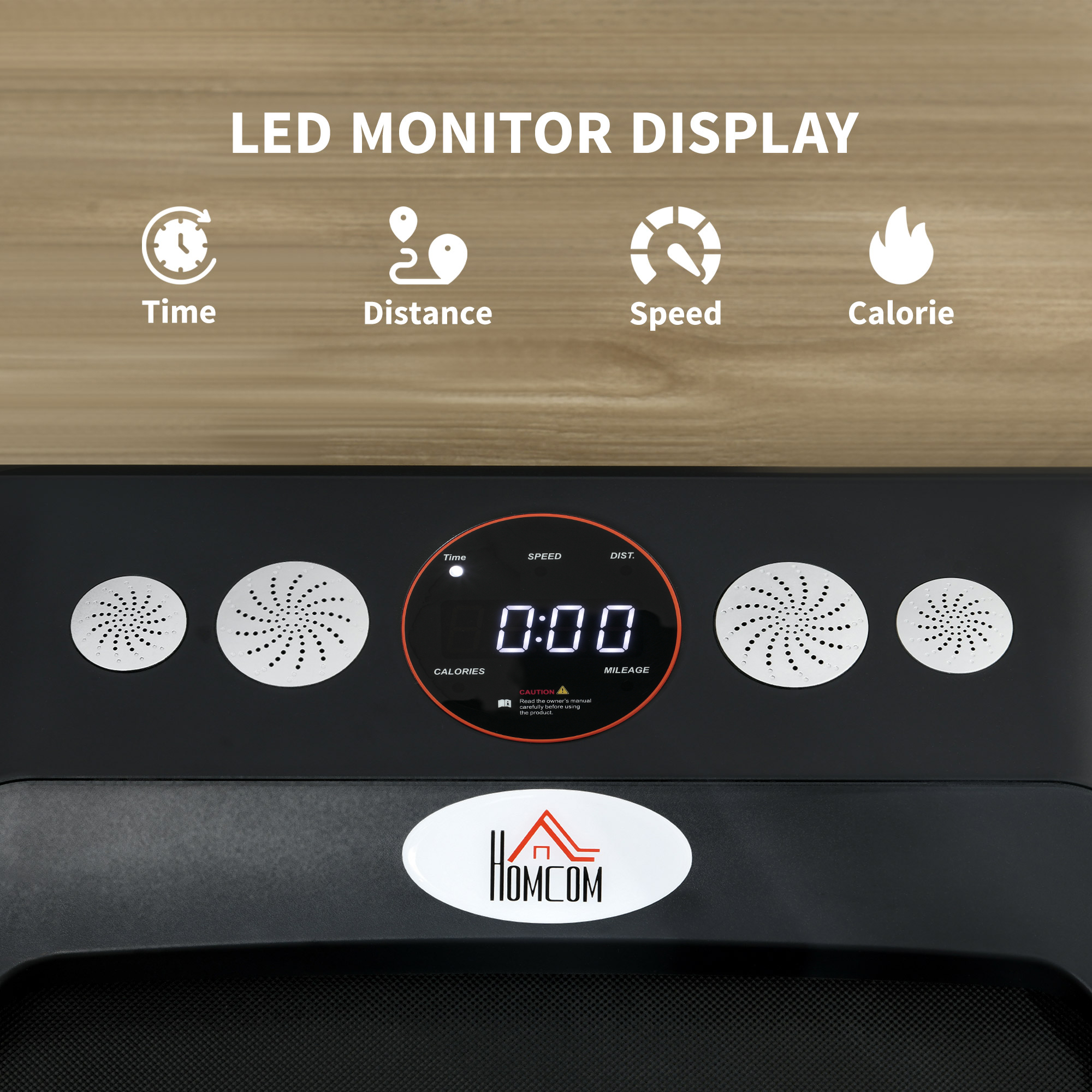 Boost your step count without leaving home with the HOMCOM walking treadmill. The built-in LED screen helps you monitor time, speed, distance and calories, keeping you on track with your fitness goals. It features a non-slip running belt for safety and a safety key that allows for quick stops if necessary. With two wheels at the bottom, it's easily portable, making it convenient to move wherever you need. Enjoy an effective and safe workout right from the comfort of your own home!