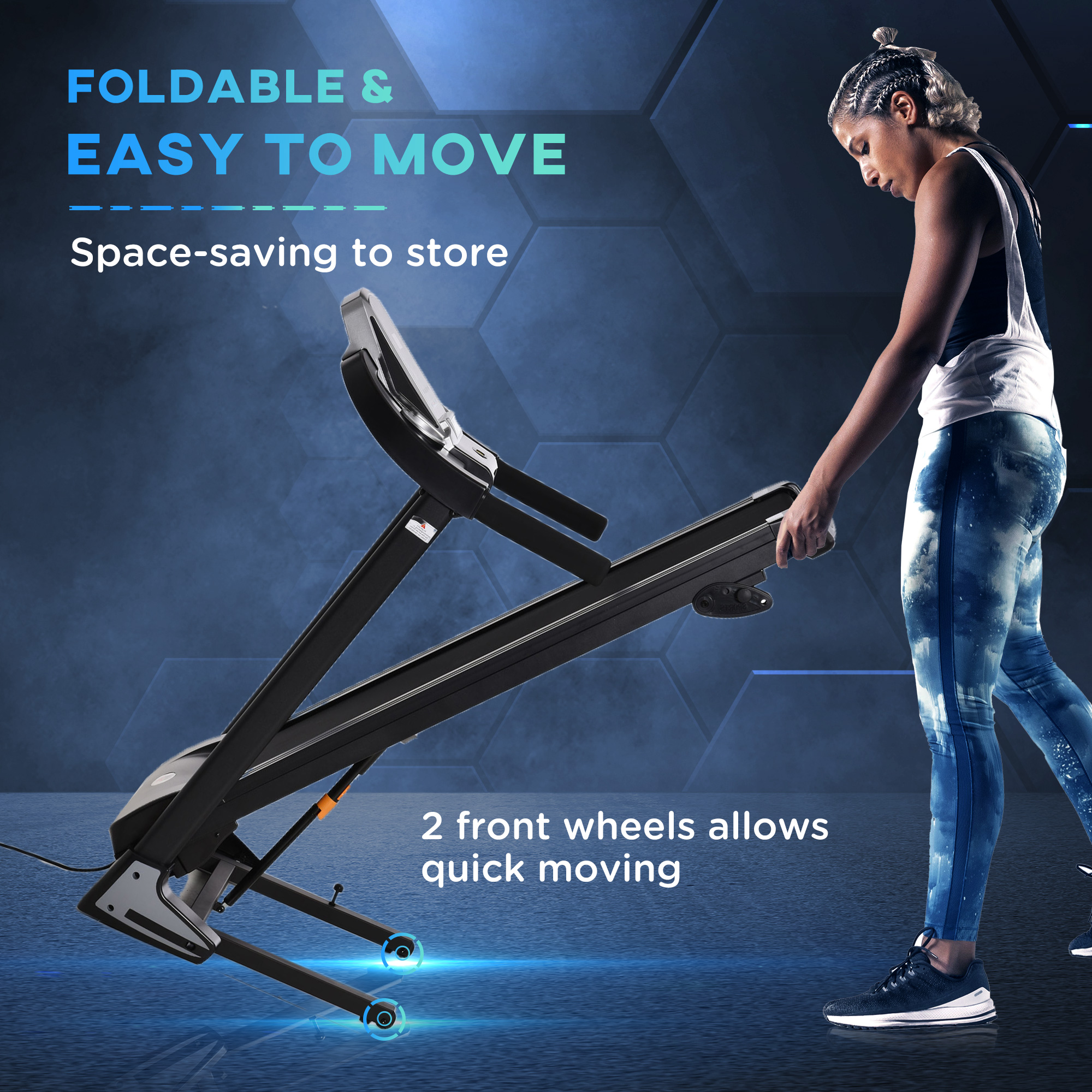 Want to stay active at home, without leaving the door? Then get this foldable treadmill from HOMCOM. The walking treadmill goes up to 12 km/h, giving you plenty of speed for a solid workout, with 12 modes to switch up your routine. The running mat angle can be positioned to three different angles. LED screen shows time, speed, distance – easy to keep track of your progress. Safety key stops walking machine immediately when pulled out. The compact treadmill completed with two wheels on the base.