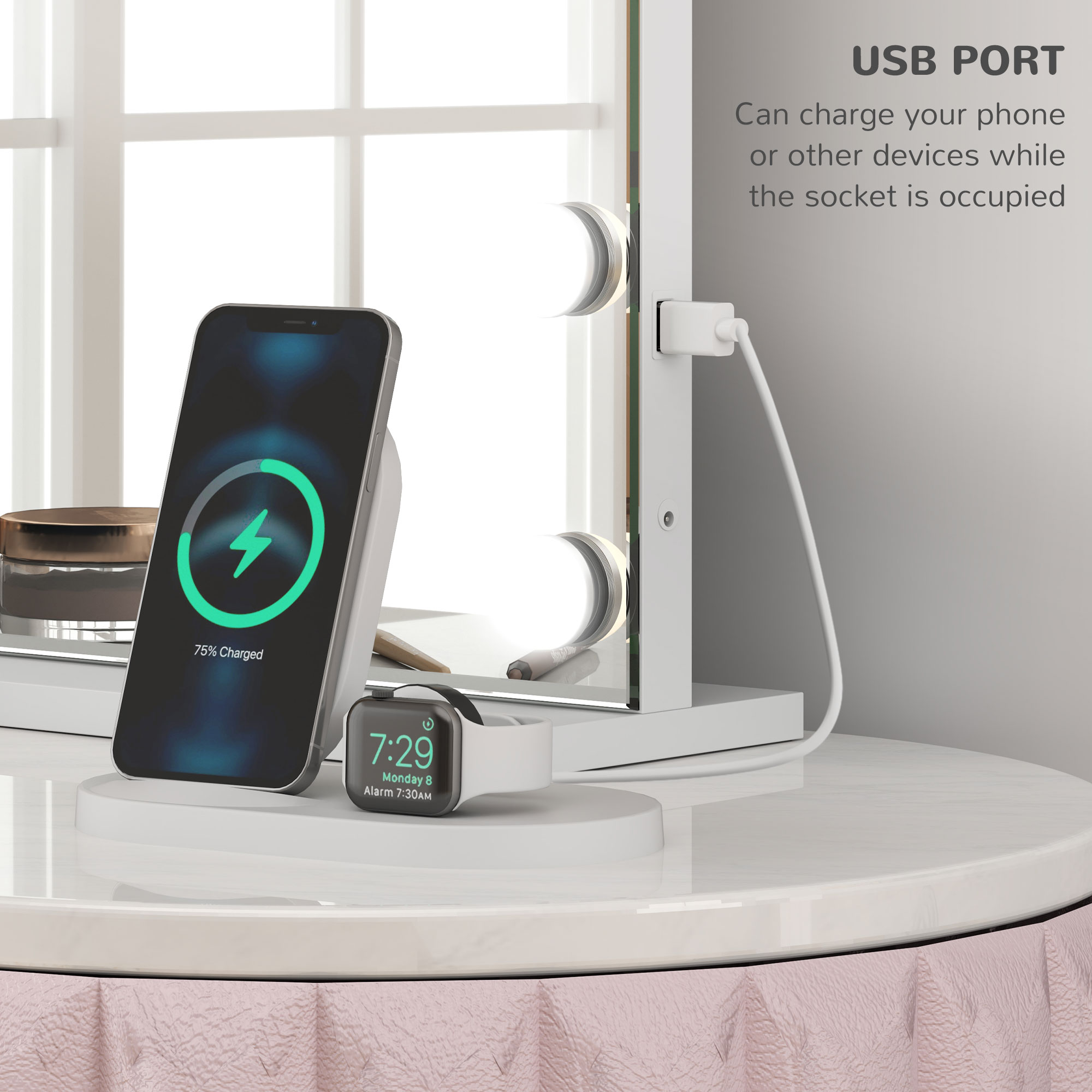 Discover the expansive view of your beauty with the HOMCOM LED vanity mirror, great for any dressing table. With 18 LED bulbs providing 50,000 hours of illumination, mastering makeup tutorials becomes a breeze. Enjoy the versatility of three lighting modes and adjustable brightness, all while keeping your devices charged with a convenient USB port.