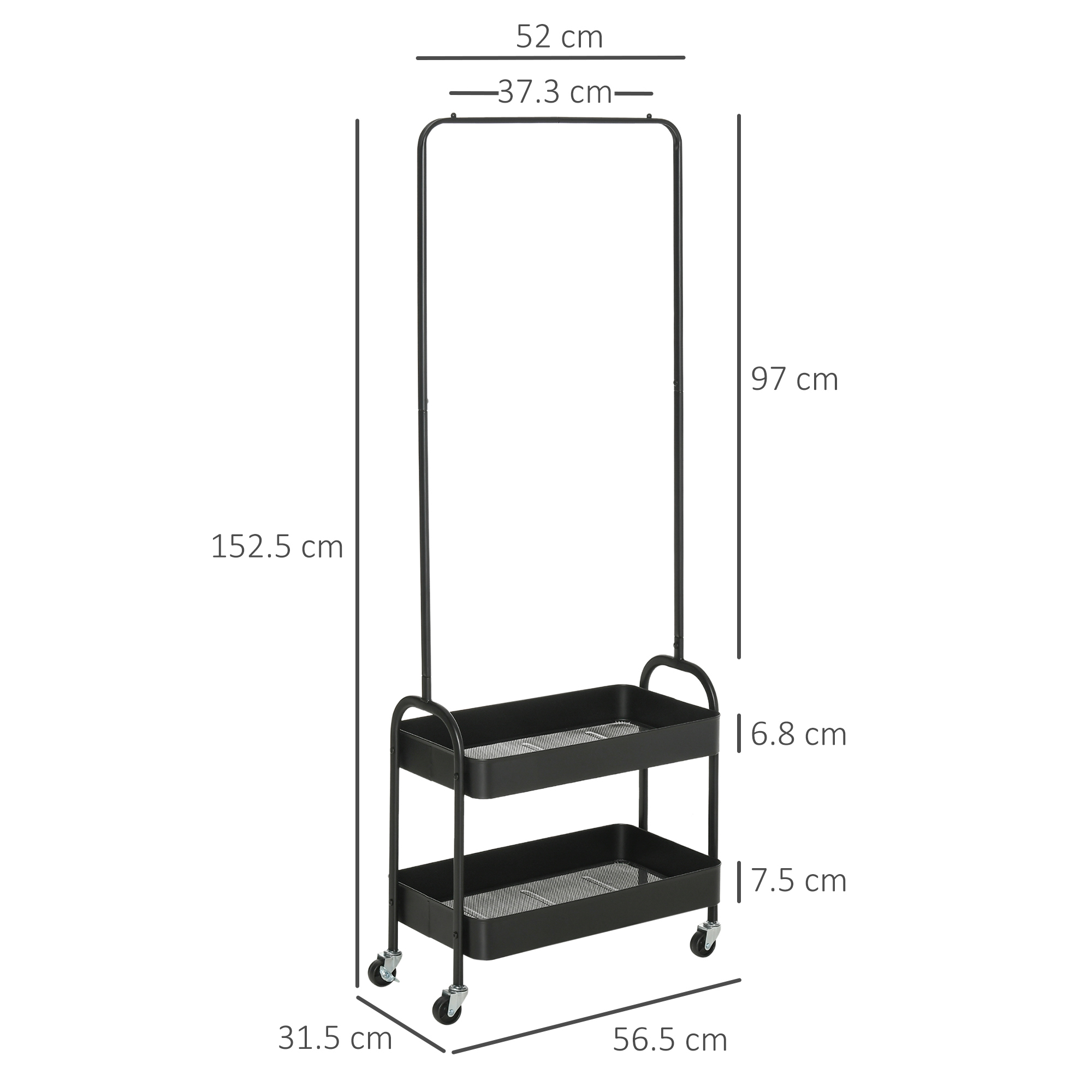 Garment hanging, made mobile with this clothes rack from HOMCOM. The small and compact size of this hanger makes it suitable for smaller chunks of clothing in tighter areas, such as hallways, entrance cupboards, cloakrooms and beyond. The frame, made from power coated metal, is strong and will hold your coats and similar with support. Two trays on the bottom make room for shoes, bags and similar. It's finished with four wheels to move around easily.