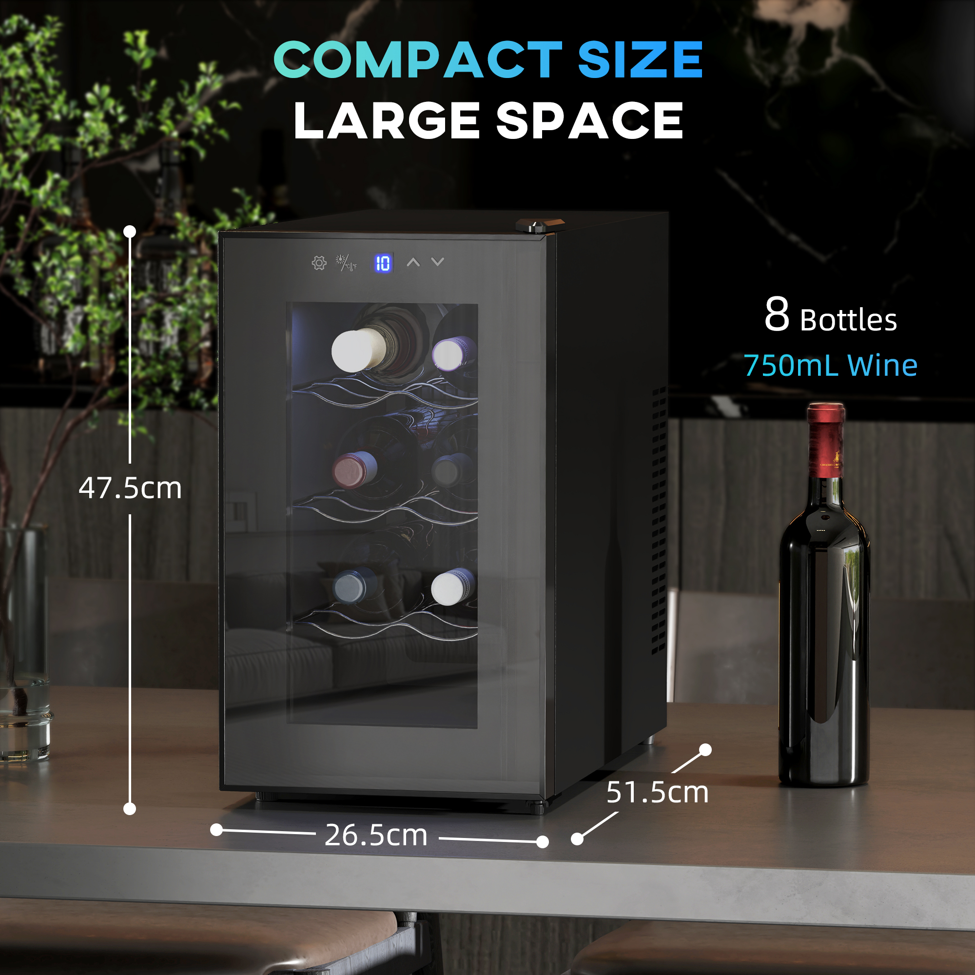 Chill your cherished bottles to perfection in this HOMCOM wine fridge. Three full-length chrome racks hold eight bottles; also adjustable to fit larger bottles when needed. Adjust the temperature between 8-18℃ to find the coolness best for you. Complete with a triple glass door, which is also resistant to damaging UV rays.