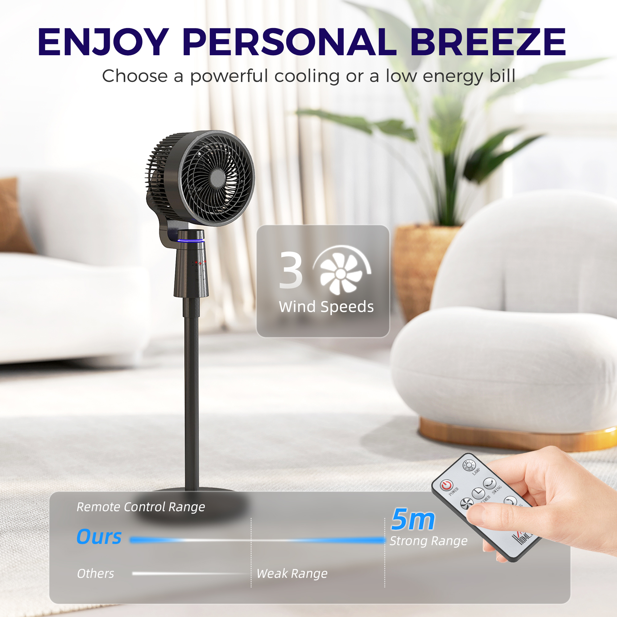 Beat the heat and chill with the HOMCOM Air Circulator Fan! Partner this bedroom fan with your air conditioner to enhance cooling, or with a humidifier for quicker fresh air. Enjoy the breeze without the sneeze, thanks to its gentle 70° horizontal and 90° vertical oscillation. Choose from three speeds for personal cooling experience. This electric floor fan is the cooling companion for your home.