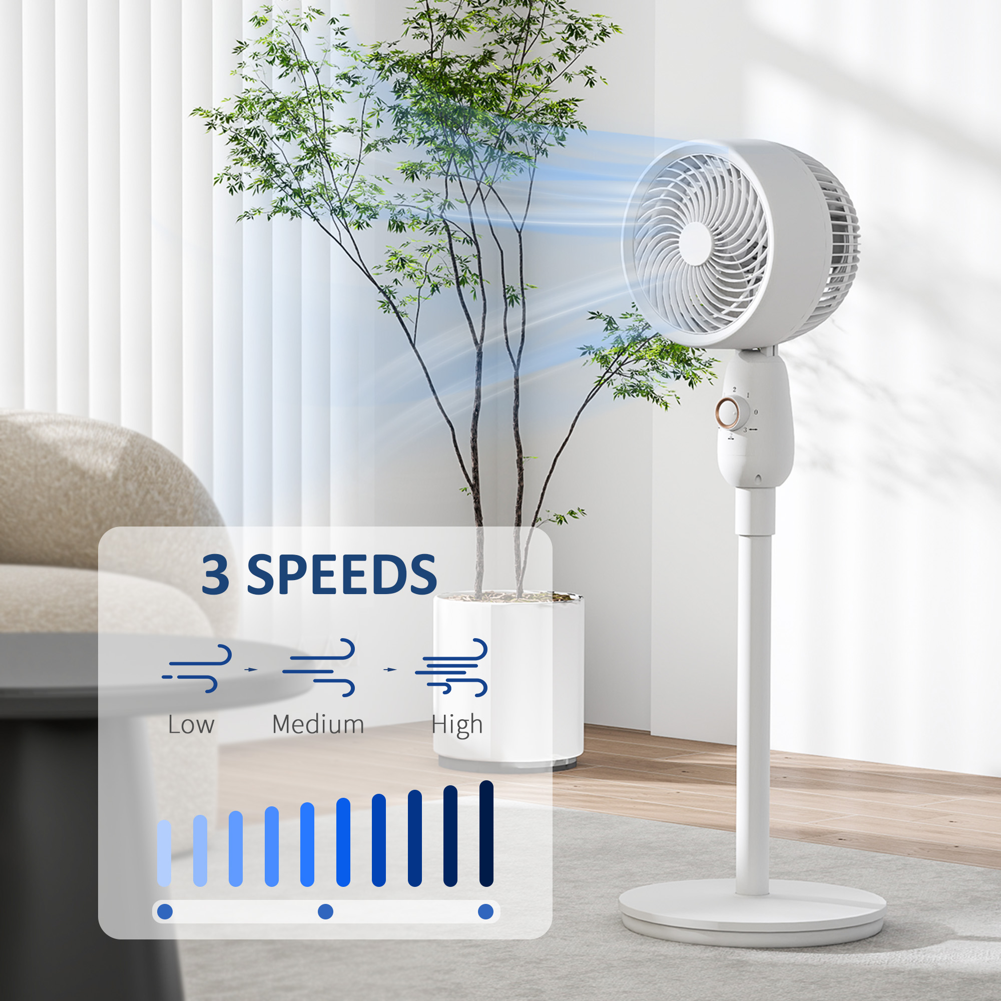 - Three-speed settings enhance cooling, ventilation and air circulation