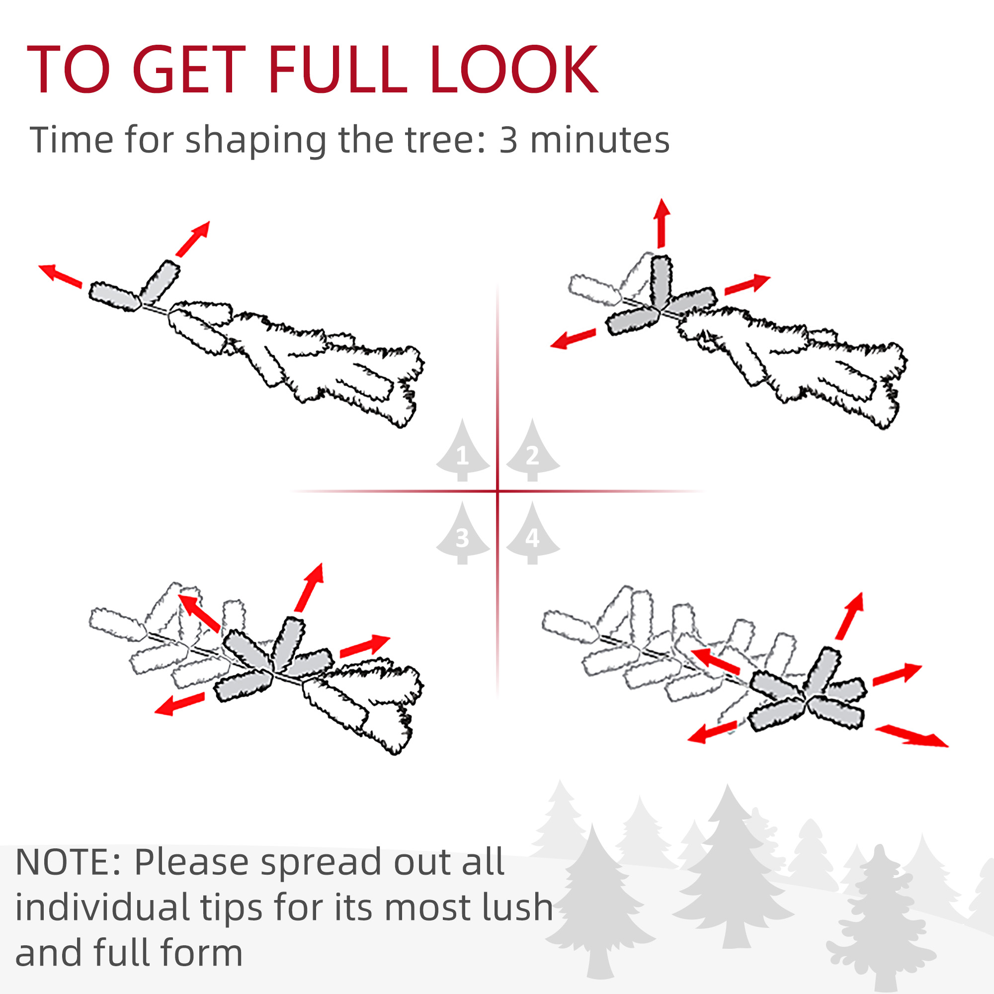 - In order to get a full appearance, please spread out all individual tips to get optimal look from the tree, suggest you to take 3 minutes to shape the tree.