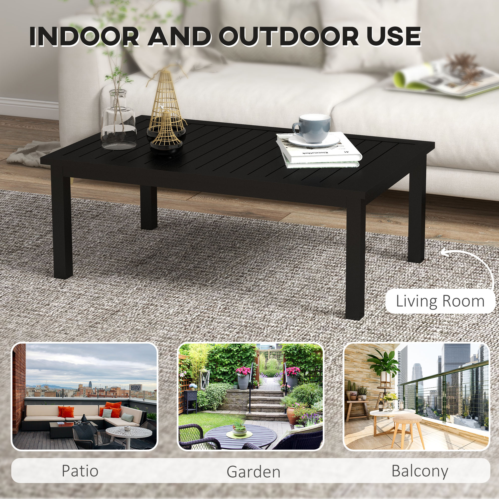 This Outsunny coffee table is a simple piece, suitable for all outdoor spaces. Made from aluminium, this is a tough piece suitable for use all year round; in a simple black finish for versatility. Complete with a slatted tabletop to prevent annoying and damaging water build-up.