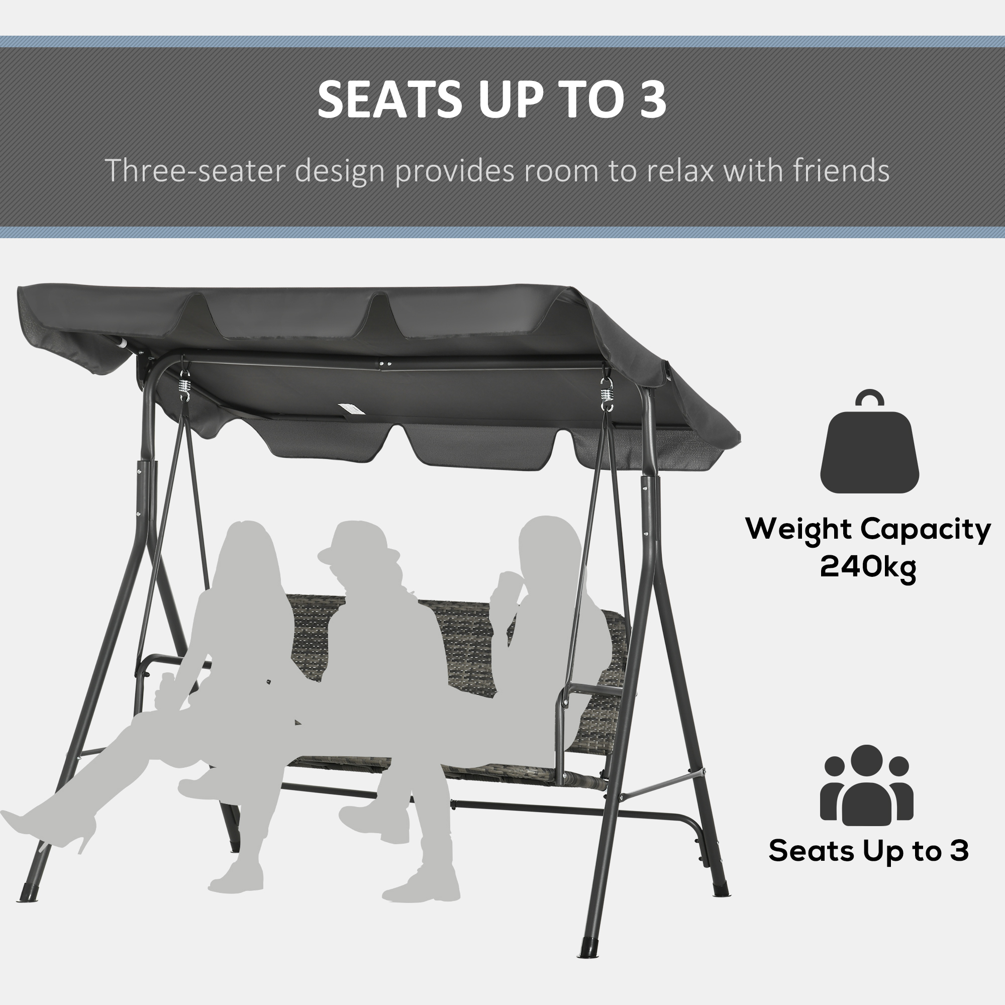 Enjoy outdoors with this Outsunny three-person swing seat. The adjustable canopy keeps your protected. The steel frame ensures a strong, supportive core. The rattan seat makes it a perfect pairing with your other on-trend garden furniture.