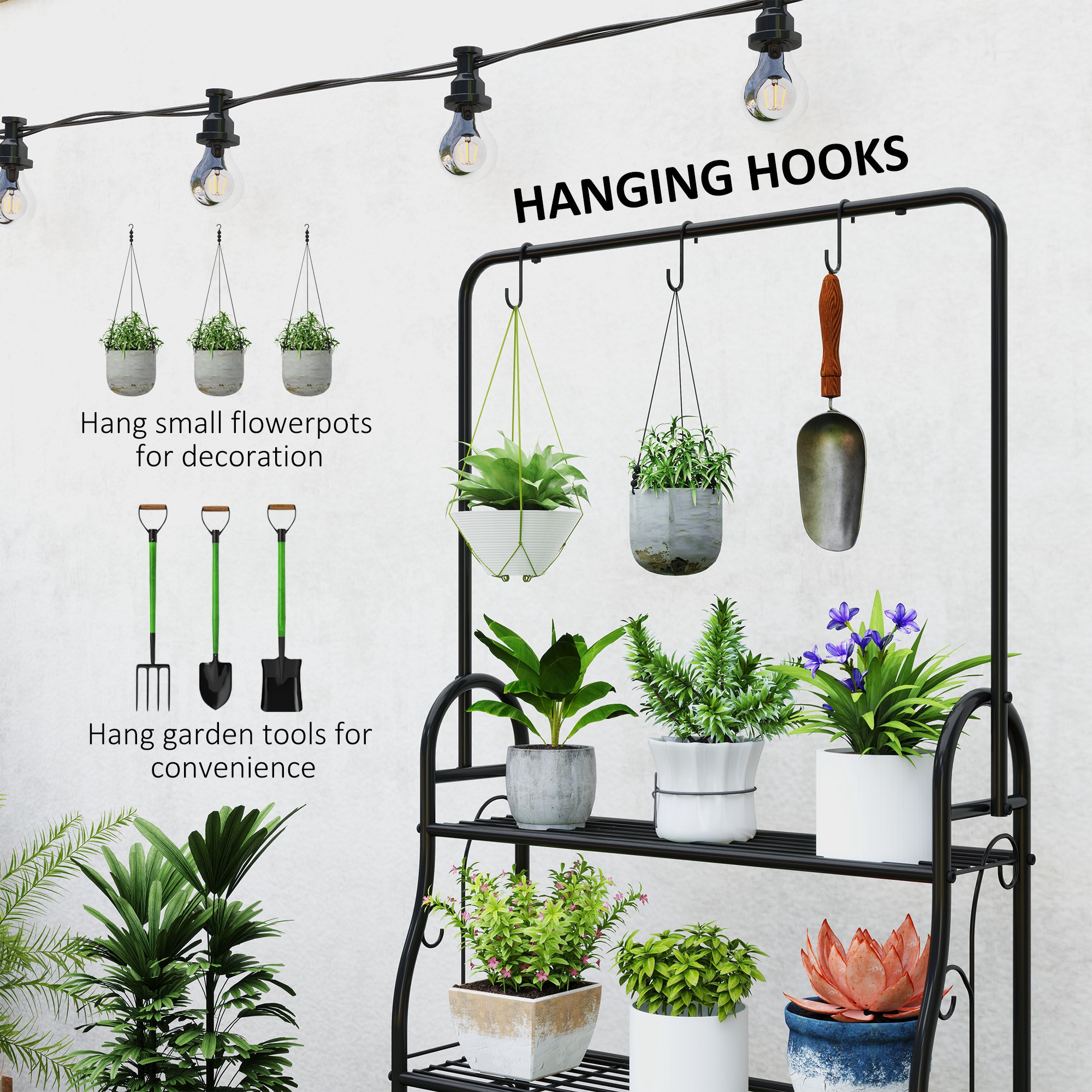 Elevate your greenery with the Outsunny Flower Stand! This three-tier plant stand not only showcases your plants beautifully but also includes handy hanging hooks for pots and tools. Crafted from rust-proof, powder-coated metal, it's great as an indoor plant stand or an outdoor plant stand. The hollow grids ensure no water build-up, making it a versatile addition to any space.