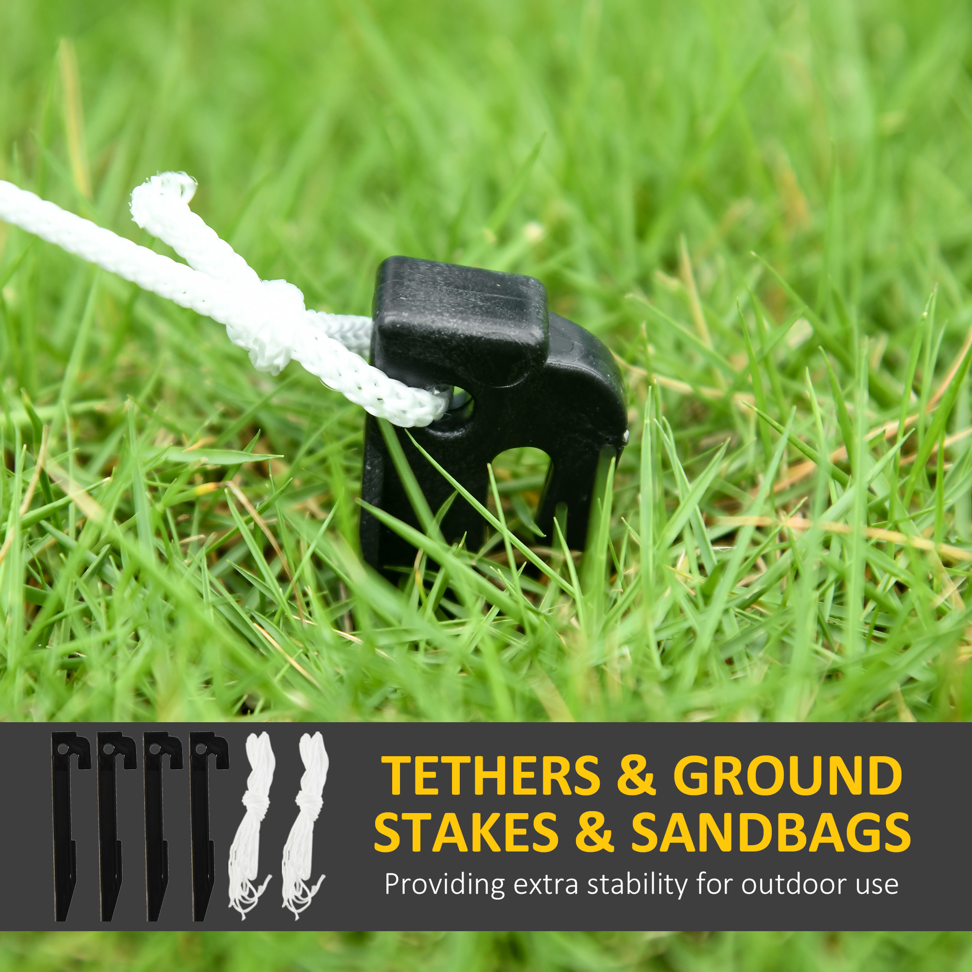 - Four ground stakes, two guy ropes and a sandbag included to pin and stabilise to the ground
