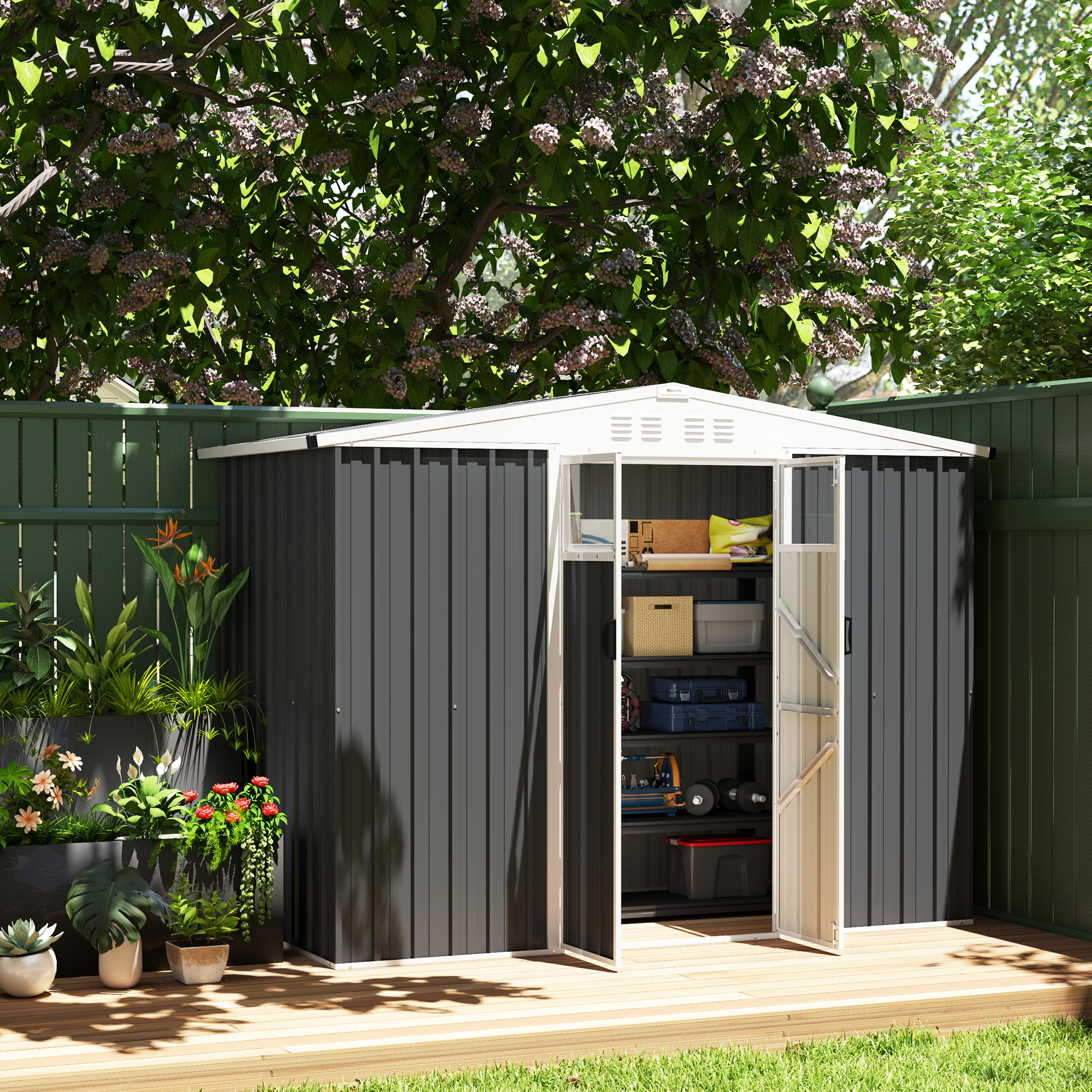 Discover the charm of tidiness with the Outsunny metal garden shed. Spaciously designed to house everything from bikes to garden tools, this garden shed features double doors for easy access and secure storage. Enjoy natural light with two transparent windows and keep the air fresh with four well-placed vents. Made from anti-UV, rust-resistant galvanised steel, it's the stylish haven for all your outdoor essentials.