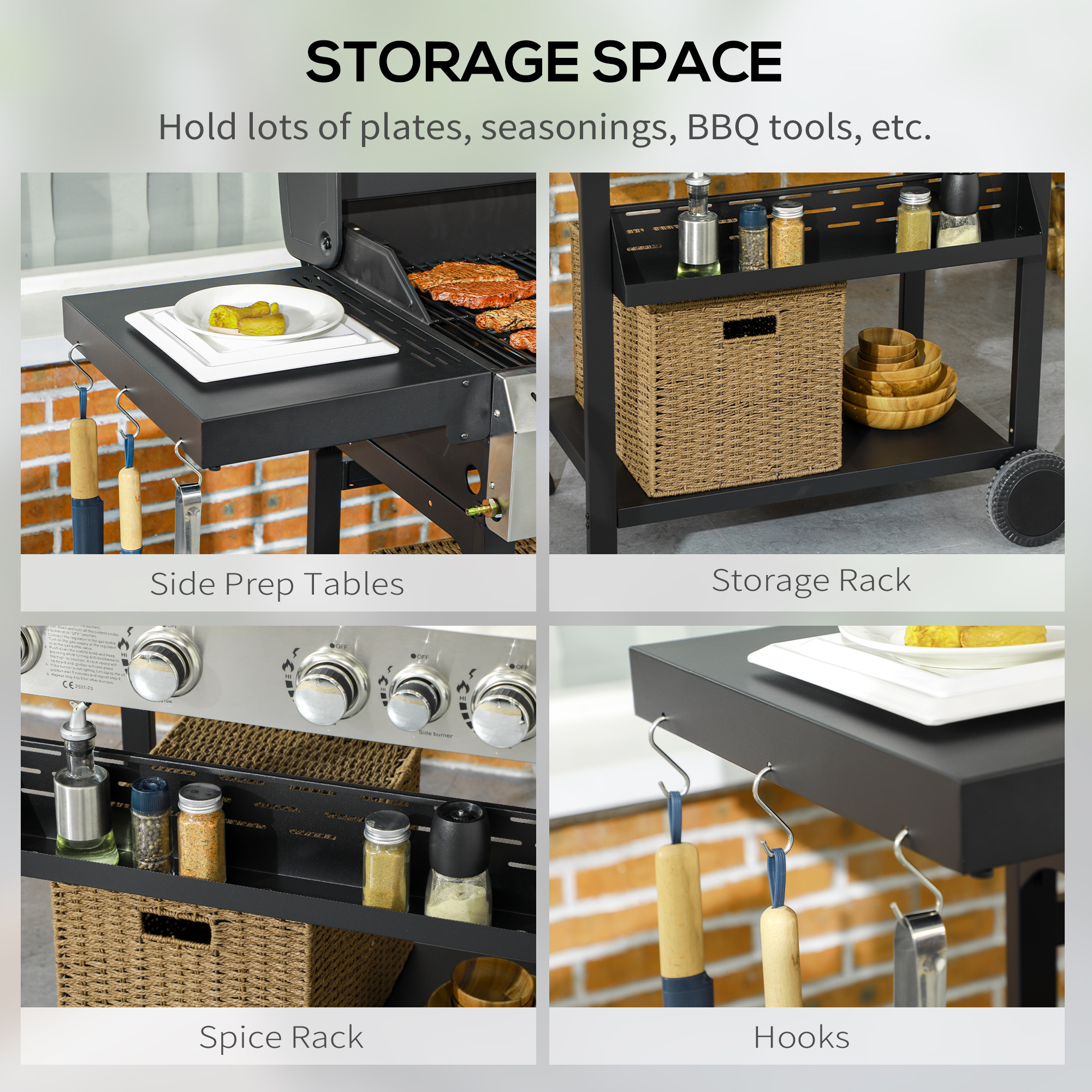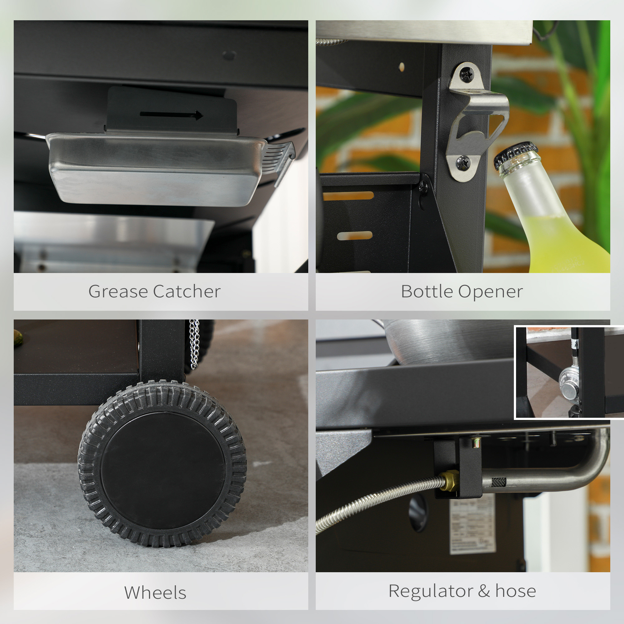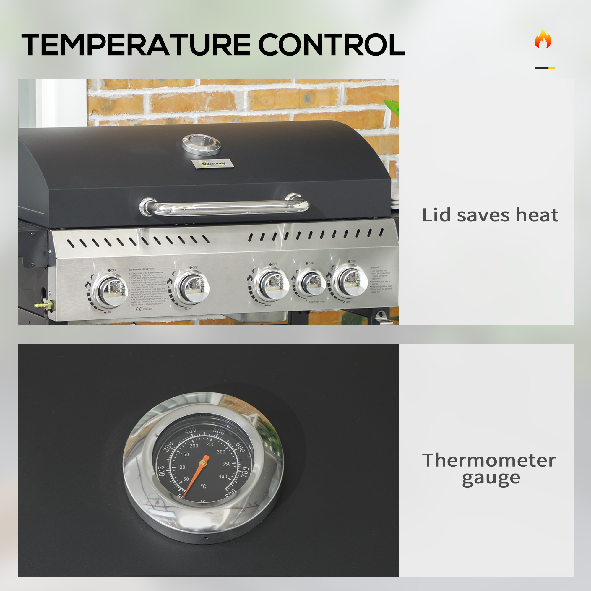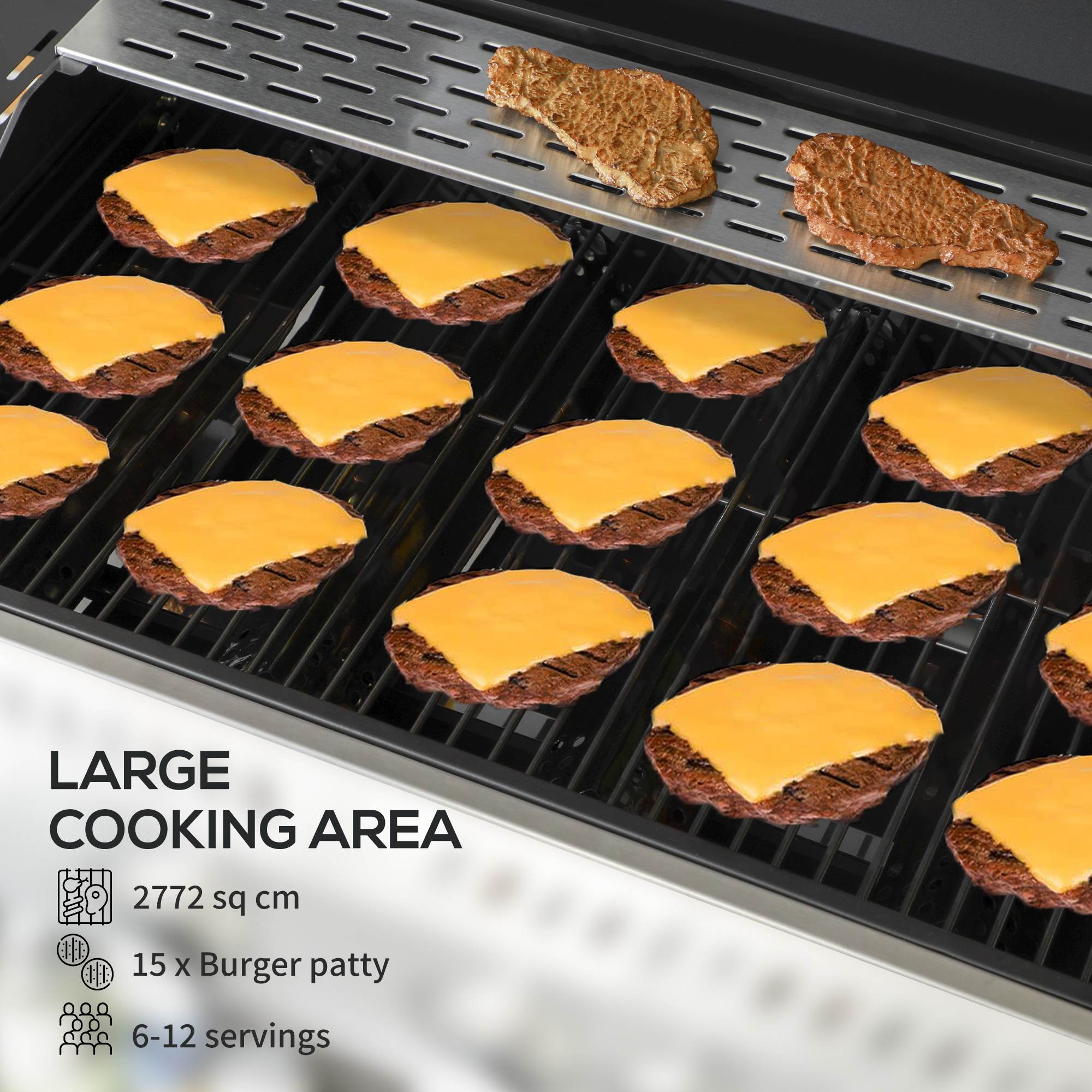 Get friends together and delicious BBQ food with this Outsunny grill. It features five independent burners, controlled by piezo ignition for easy, separate operation. The large 2772cm² grilling area is enough for 6-12 people party. Cleanup is hassle-free with the grease catcher, with the built-in bottle opener for beers. Have freshly cooked food at your fingertips, whenever.