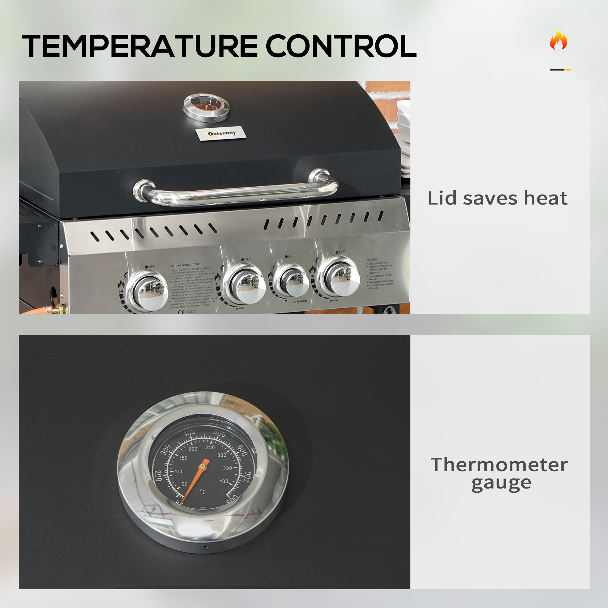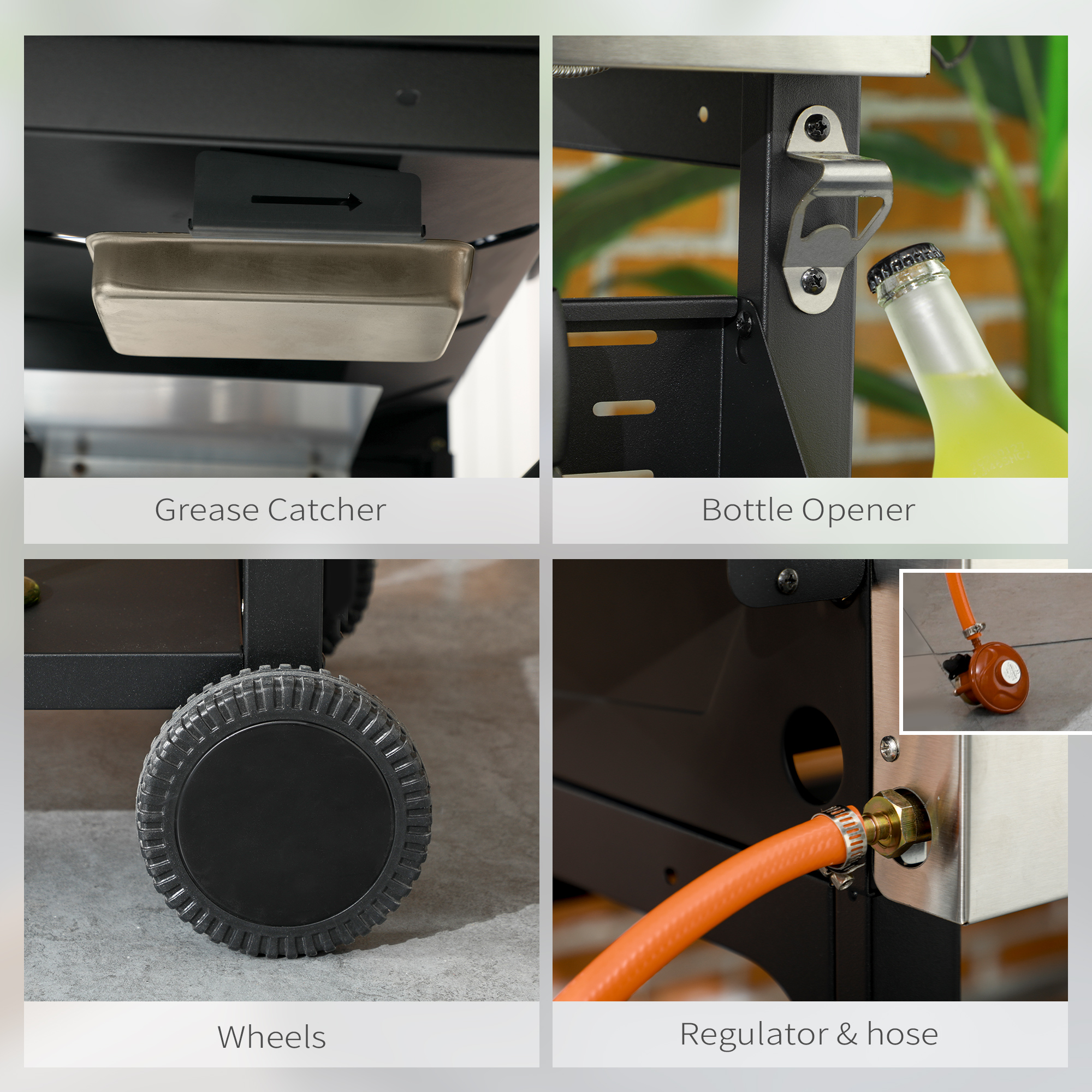 Get friends together and delicious BBQ food with this Outsunny grill. It features four independent burners, controlled by piezo ignition for easy, separate operation. The large 2282cm² grilling area is enough for 5-10 people party. Cleanup is hassle-free with the grease catcher, with the built-in bottle opener for beers. Have freshly cooked food at your fingertips, whenever.