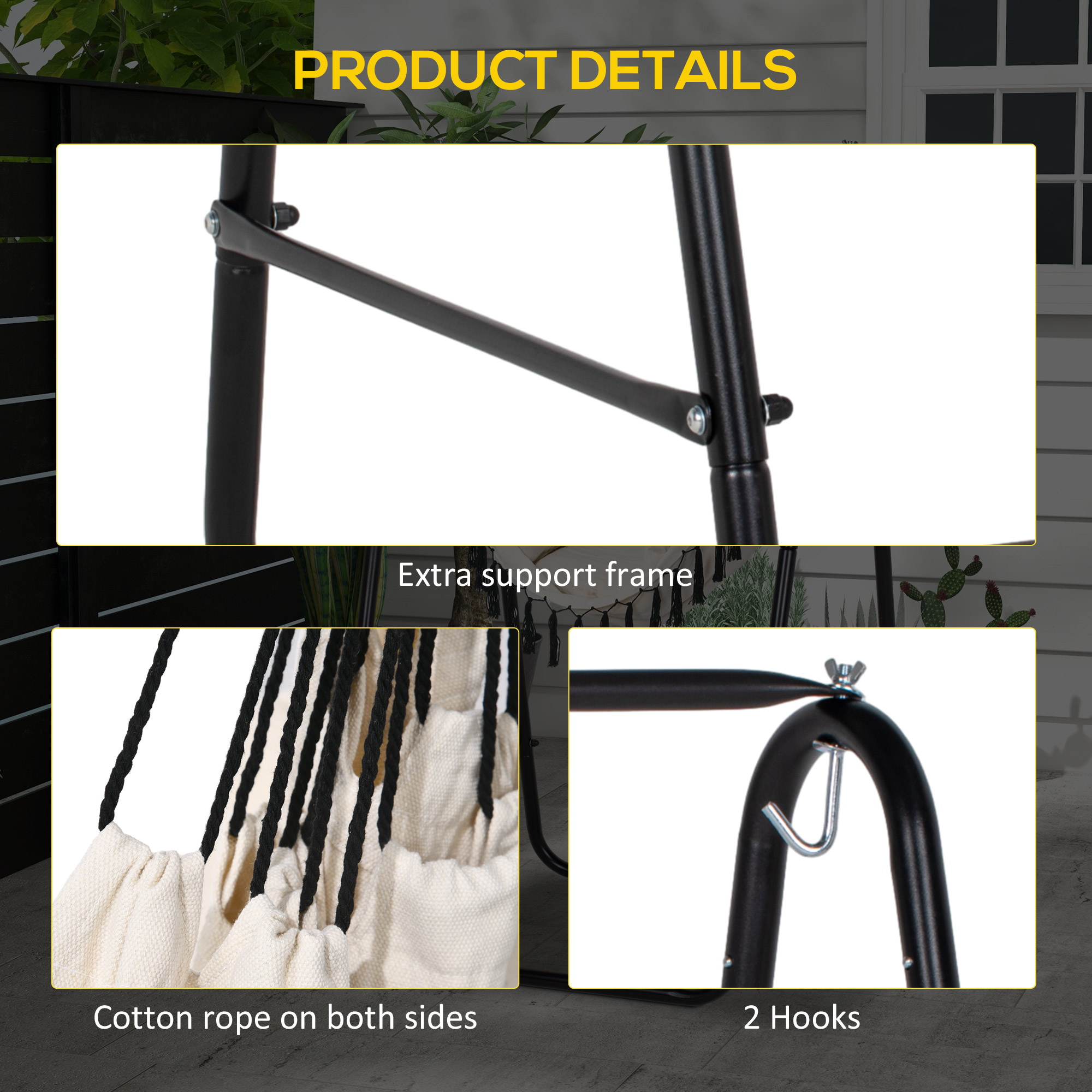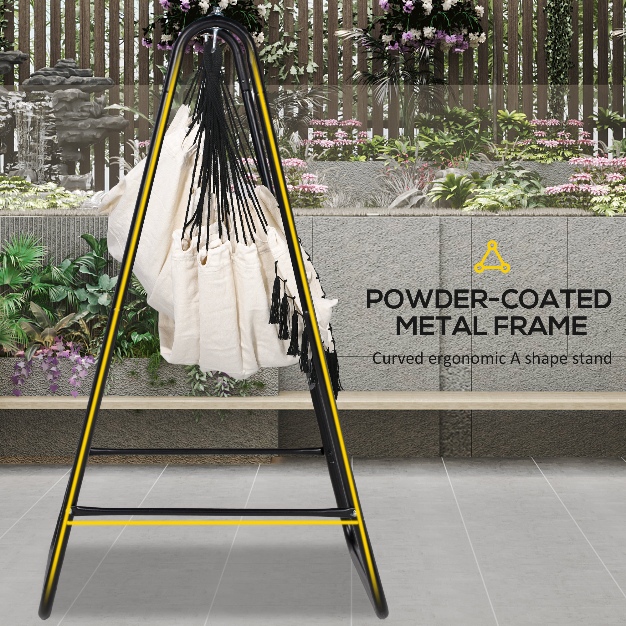 Relax in your own garden with this Outsunny garden hammock chair. A solid metal frame for a strong, supportive core - the cotton hammock seat hugs you in comfortably. The A shape of the chair curves with your body for maximum comfort. Soft padded cushion is soft. Quick and easy to set up.