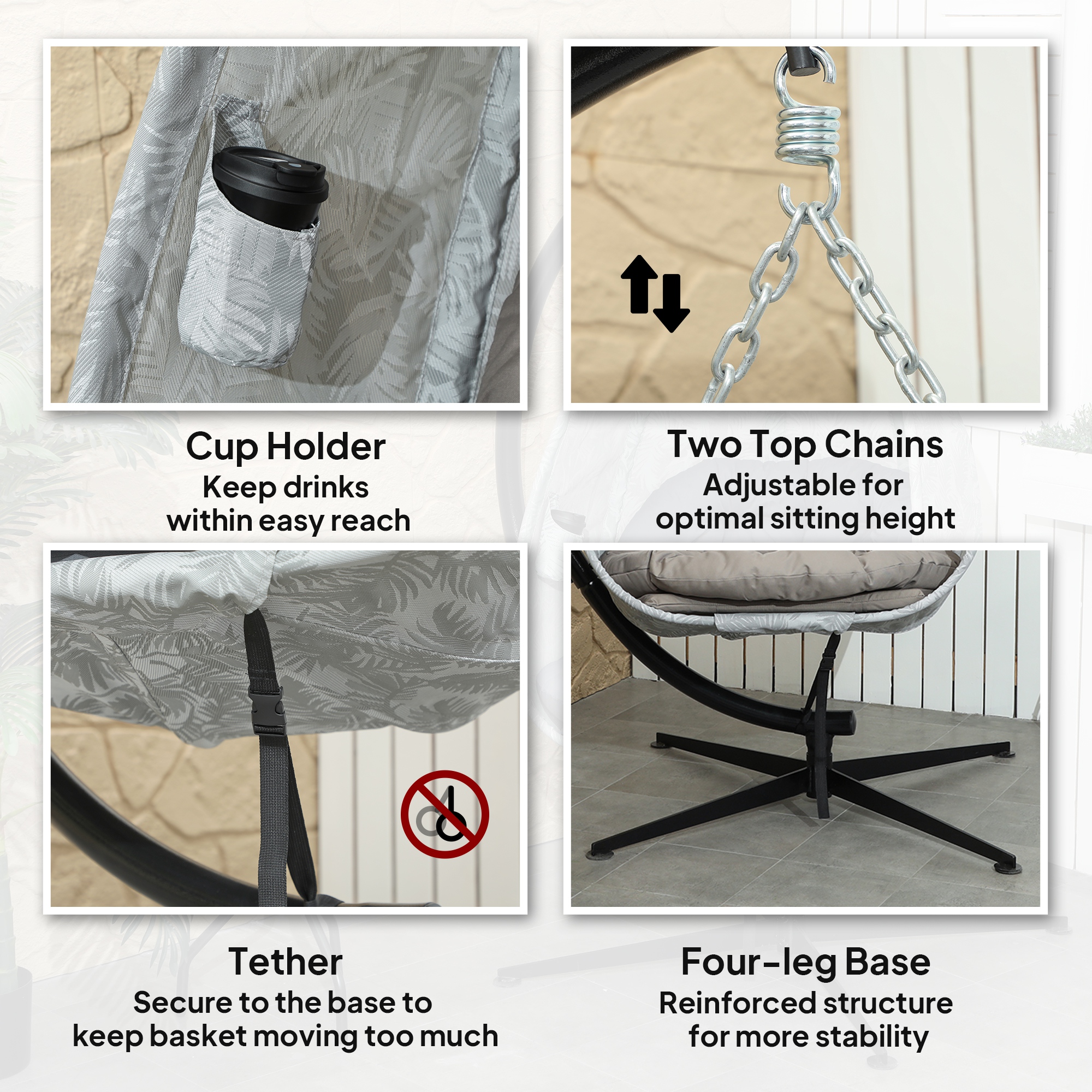 Relax in optimal comfort with this outdoor egg chair from Outsunny! With a wide seat covered in feathery leaves pattern texteline fabric, this egg garden chair offers cosy, bird-nest-like retreat. The folding basket allows easy storage, with a cup holder keeping your drink close. A large 13 cm thickened cushion and a bottom cushion offer cloud-like comfort. Powder-coated steel frame and X-shaped base mean a stable swinging egg chair. Adjustable top chains customise your swinging experience.