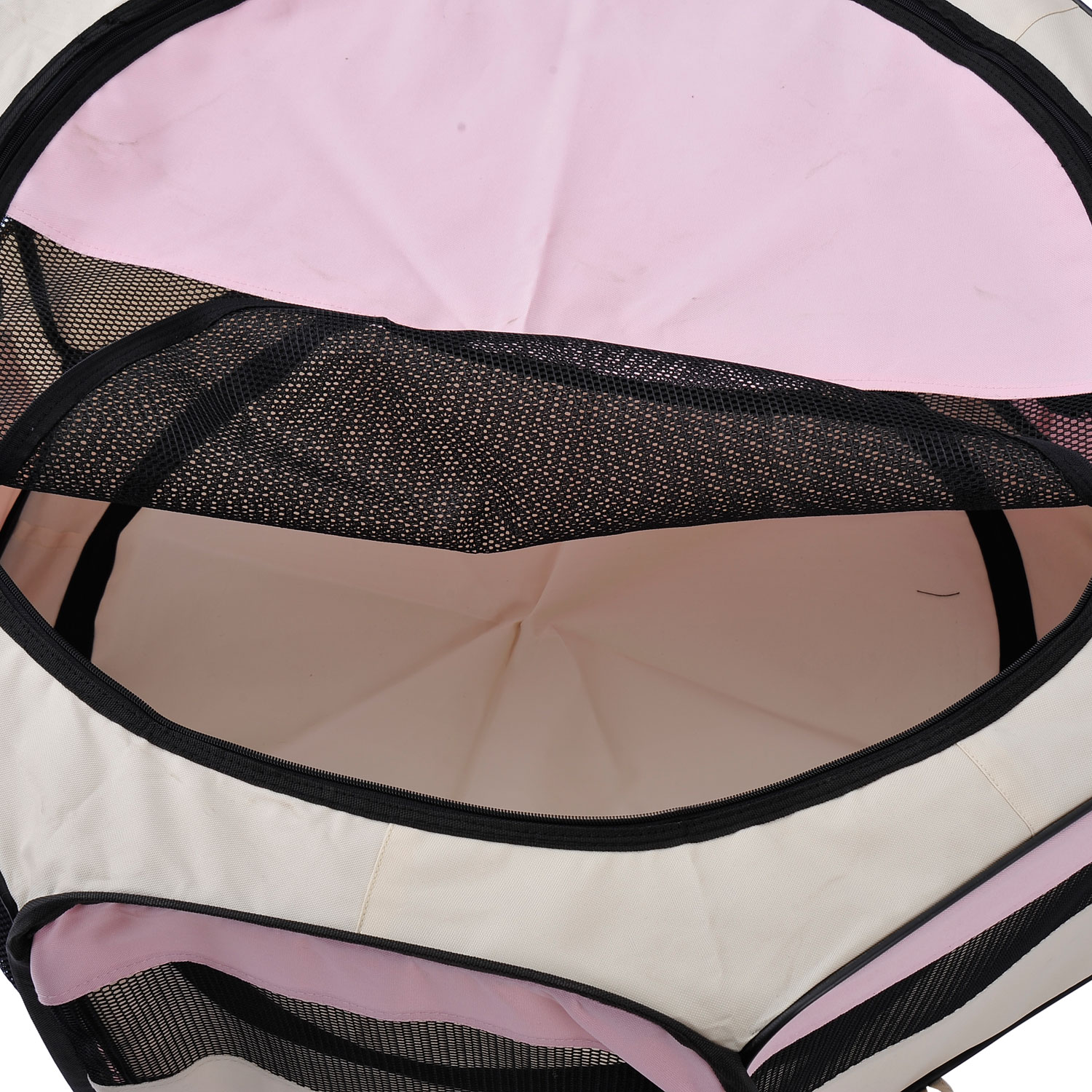 This stylish puppy playpen in octagon shape is a great solution for cat, dog and other small animals. They can be kept safe in countless circumstance, perfect for travel. 8 panels with breathable mesh are beneficial for air flow and visibility. Mesh cloth top cover fixed with zipper for safety and shade, 2 roll up and zipped doors for easy access. Pets will play and take exercise in it safely and comfortably. Lightweight and portable, also includes a carrying bag for easy transport.